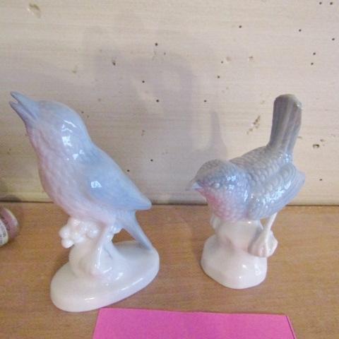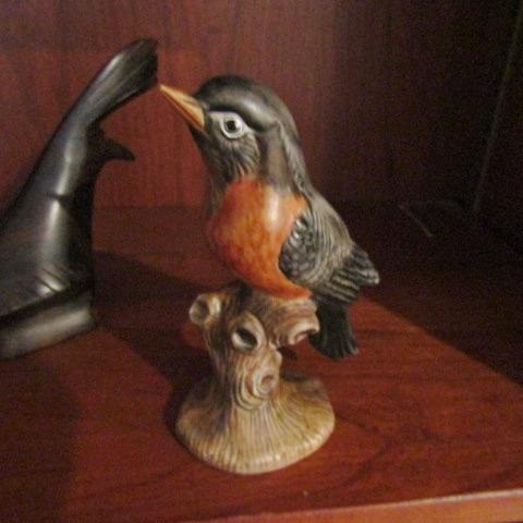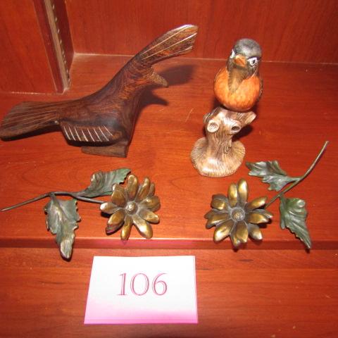 CERAMIC ROBIN AND 2 METAL FLOWERS (THEY HAVE SOME PAINT LOSS)