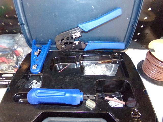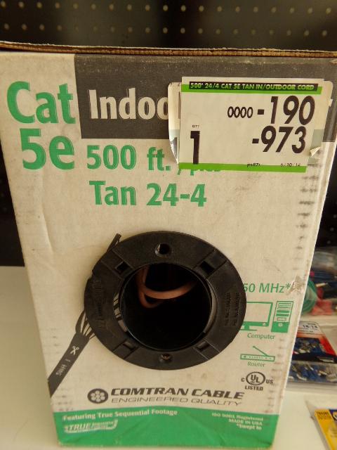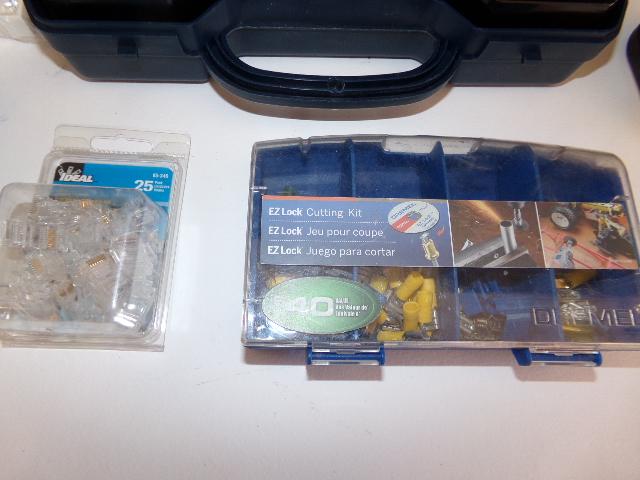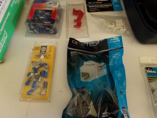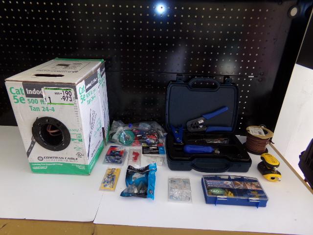 SPOLL OF CAT 5e WIRE, CABLE TESTER, COMTRAN 24-4 TAN WIRE BOX, SNAP IN BLANK, INSERT, LOCK CUTTING KIT, ETC