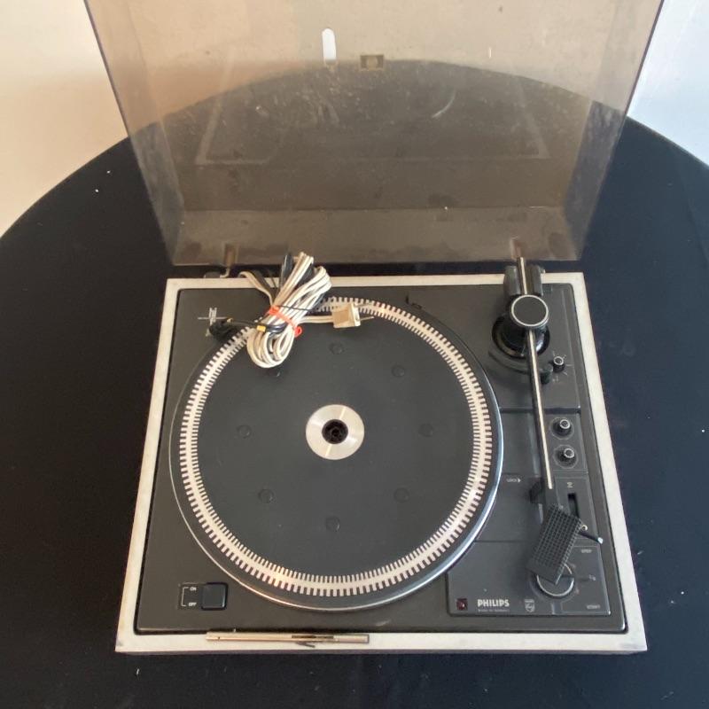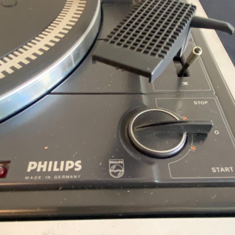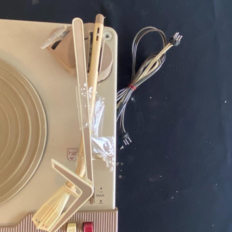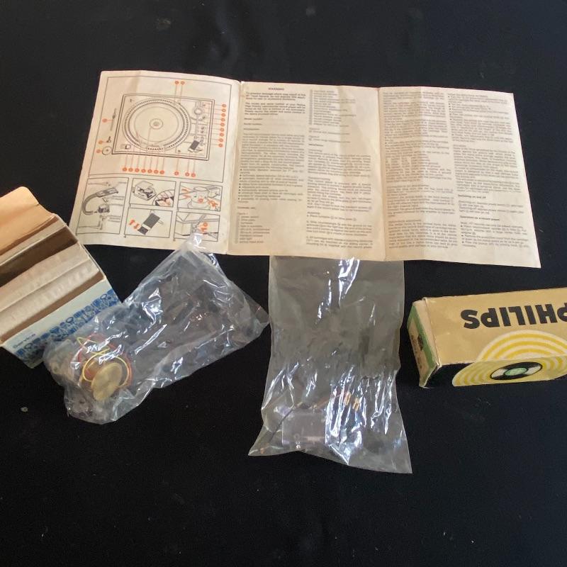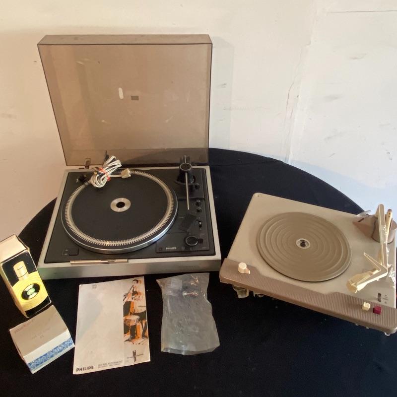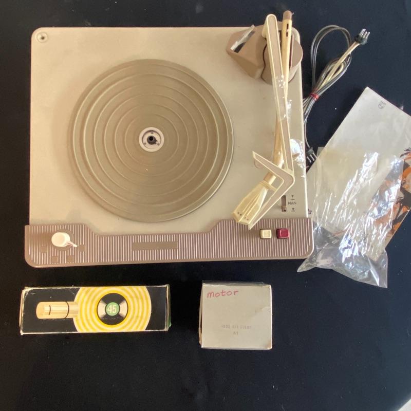 Lot includes Phillips automatic 406 Turntable. Gray base and plastic lid attached with hinges in the back create this complete unit. Cords are attached unit turned on when tested but did not spin. Standalone tan Phillips Turntable. Made in Germany. Includes Phillips service motor 4822 361 20132 A1 as well as additional parts and owners manual. See photos.