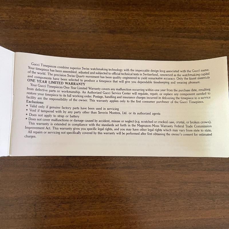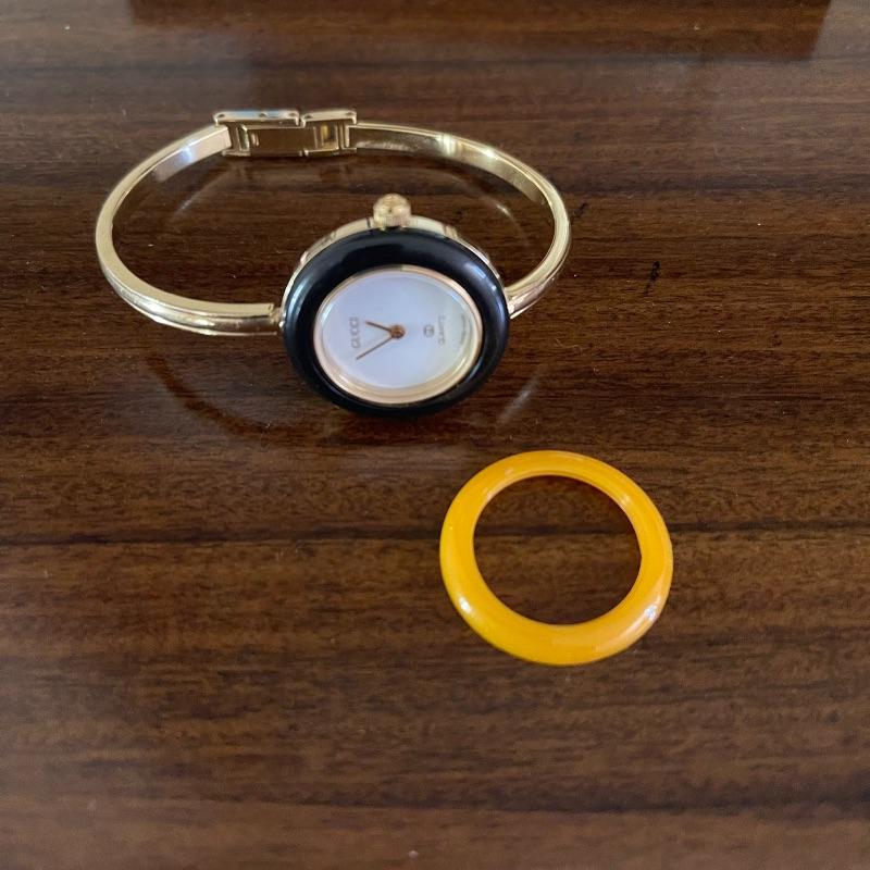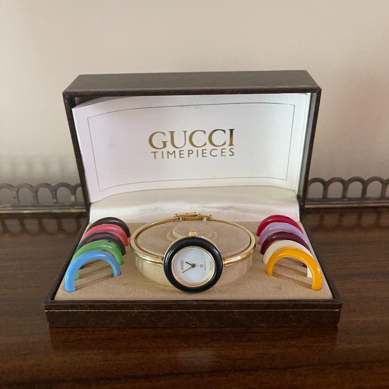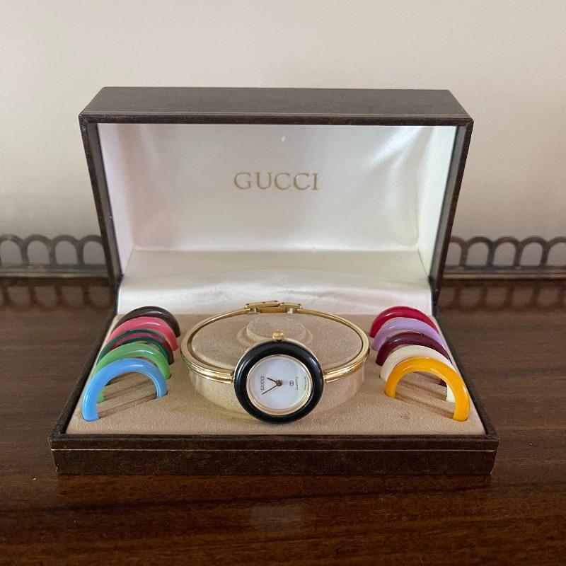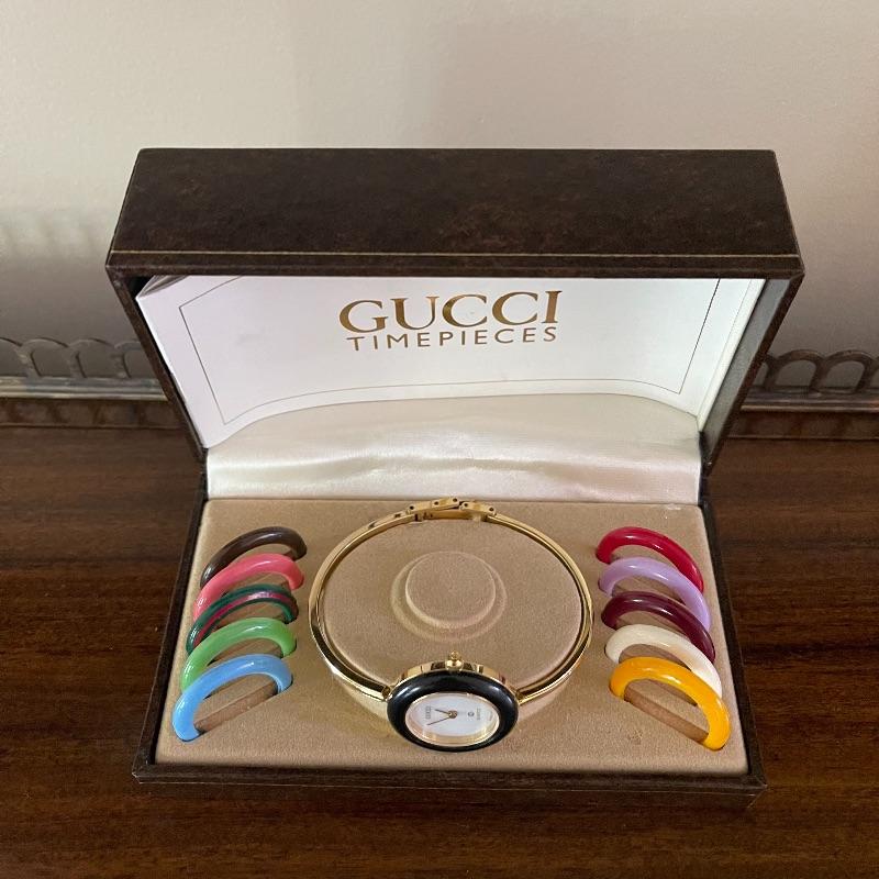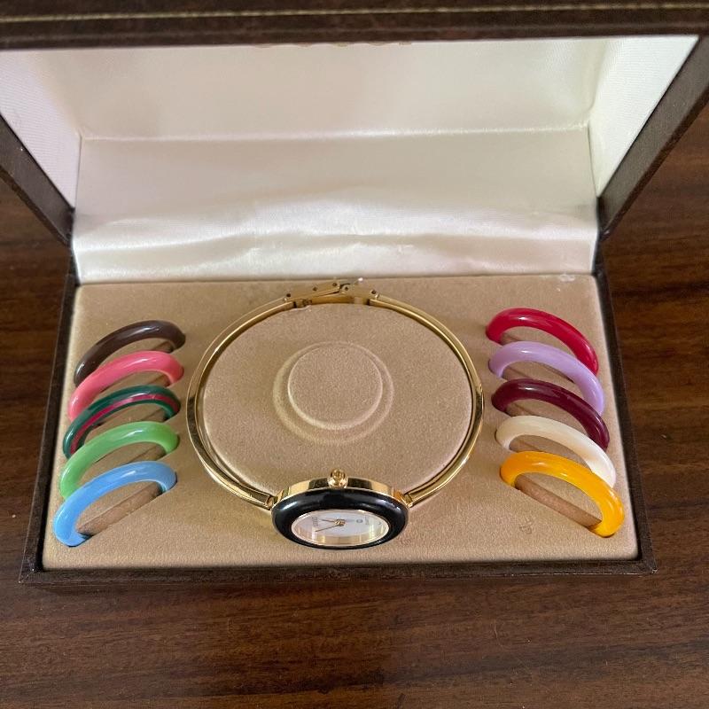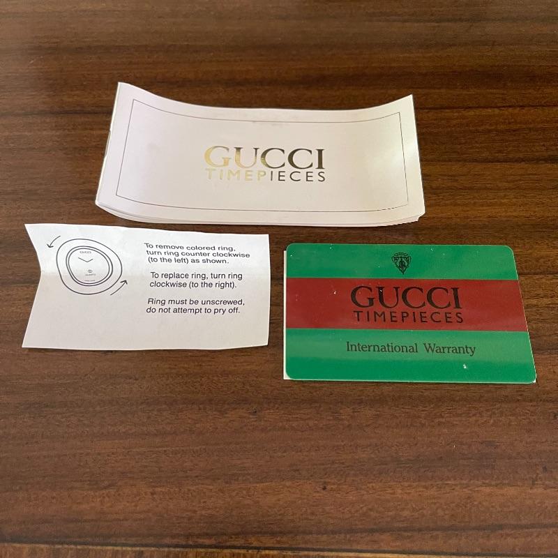 Women’s Gucci watch with changeable colored bands for around the face. The face says “Gucci,” “Quartz,” and “Swiss Made.” The back has the numbers 1100-L and 004-091. There is an international warranty card as well. Not currently working, most likely needs a battery change.