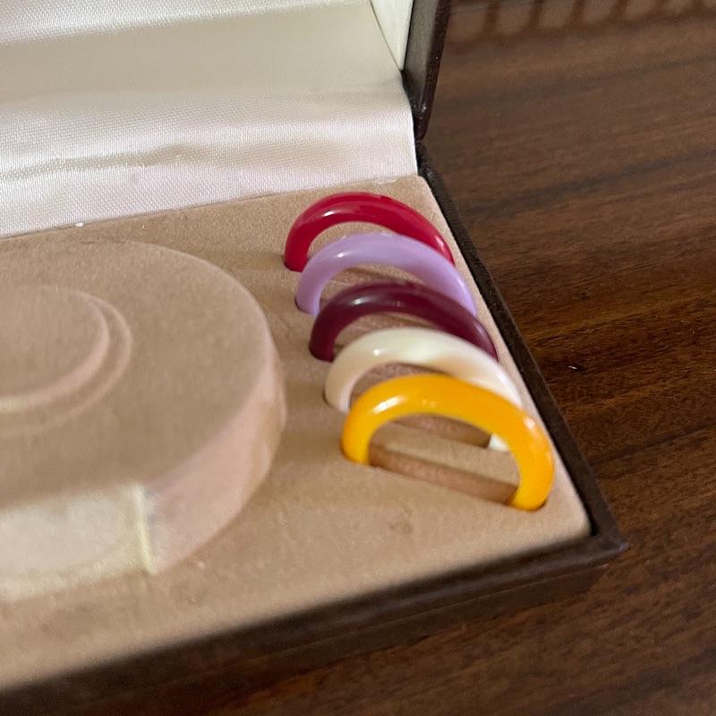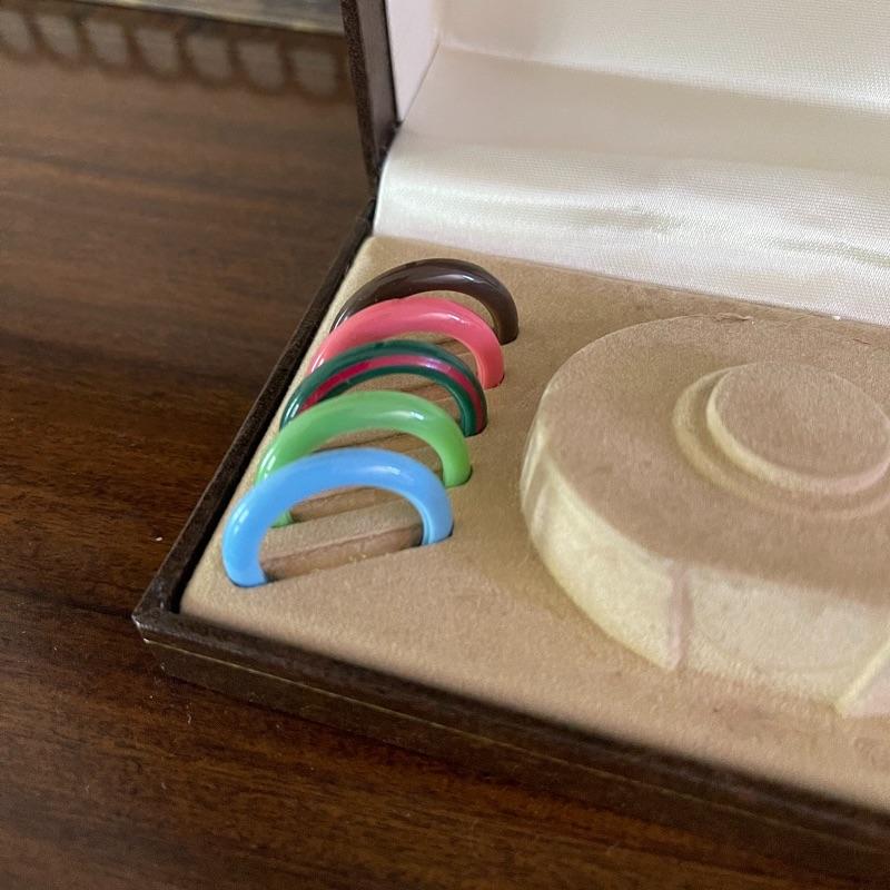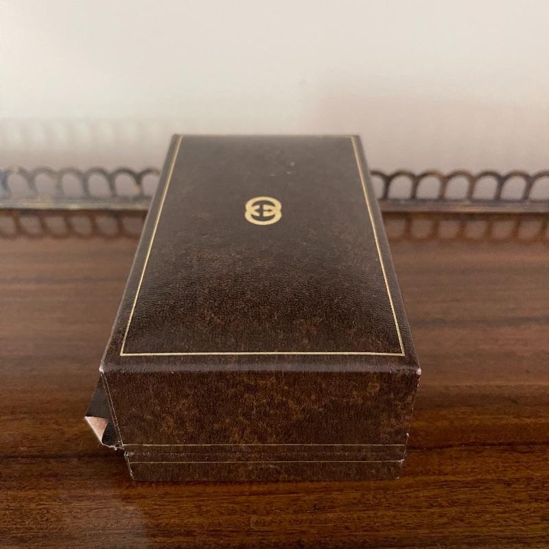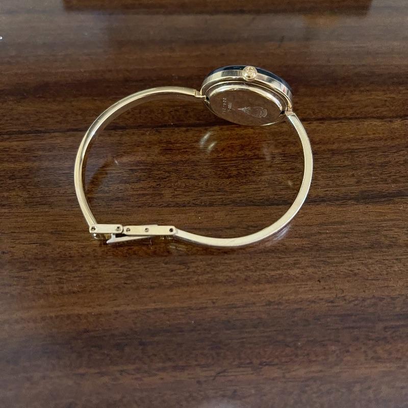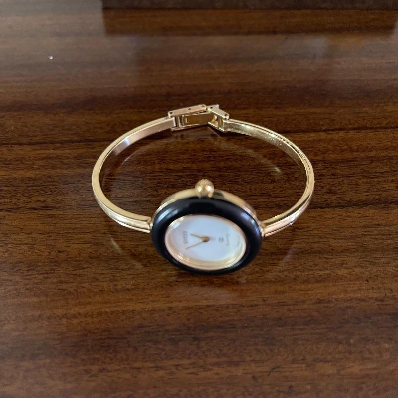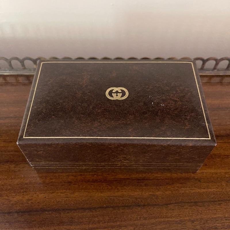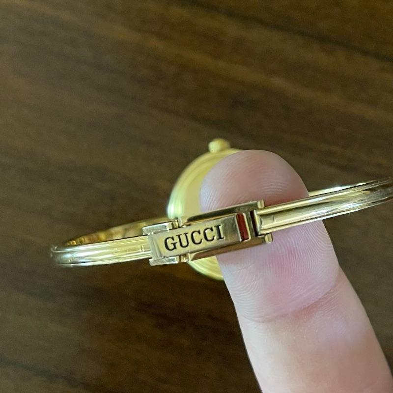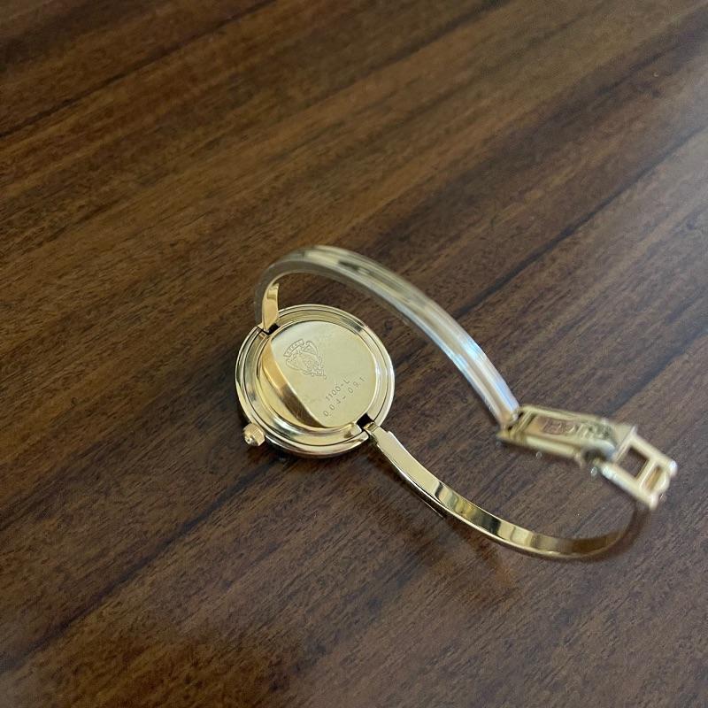 Women’s Gucci watch with changeable colored bands for around the face. The face says “Gucci,” “Quartz,” and “Swiss Made.” The back has the numbers 1100-L and 004-091. There is an international warranty card as well. Not currently working, most likely needs a battery change.