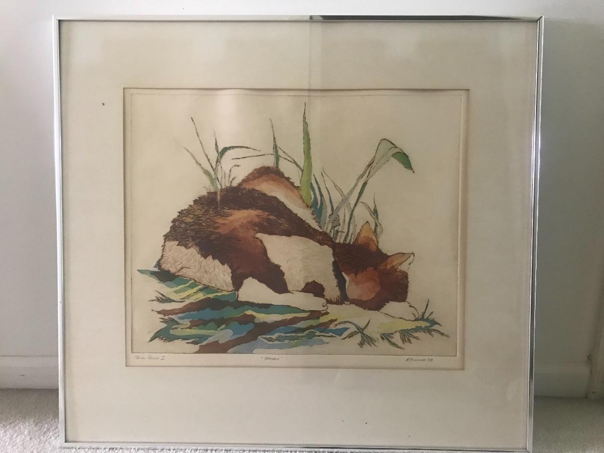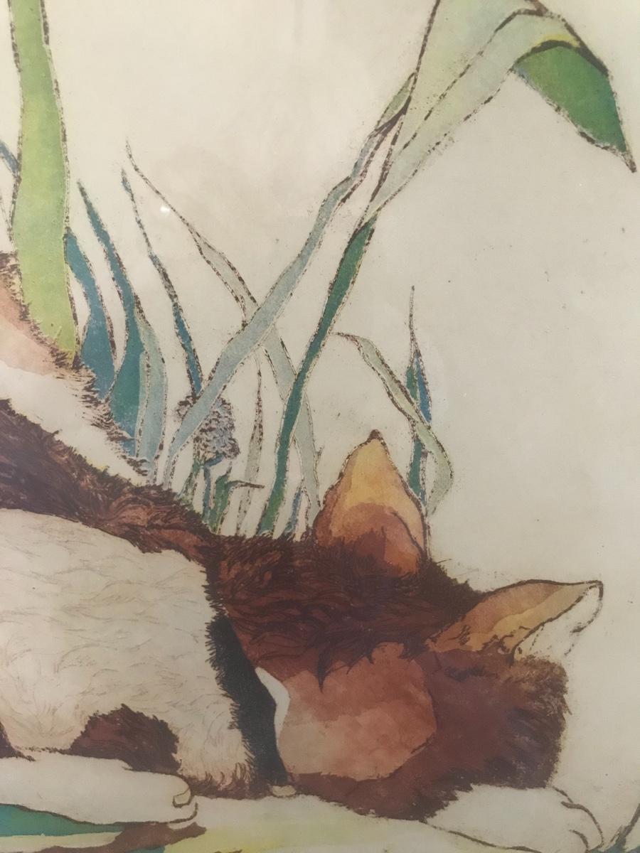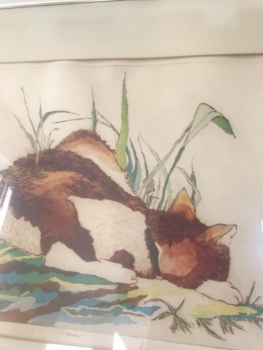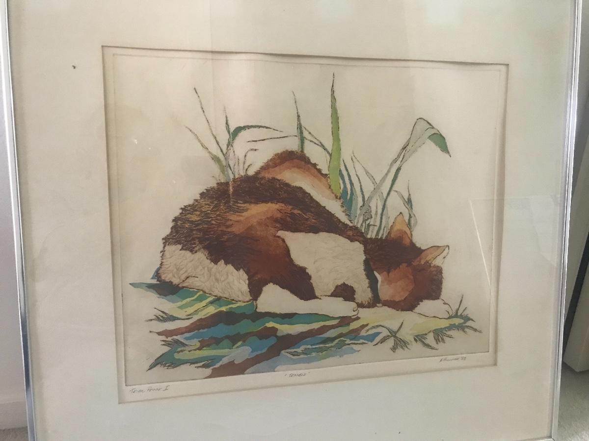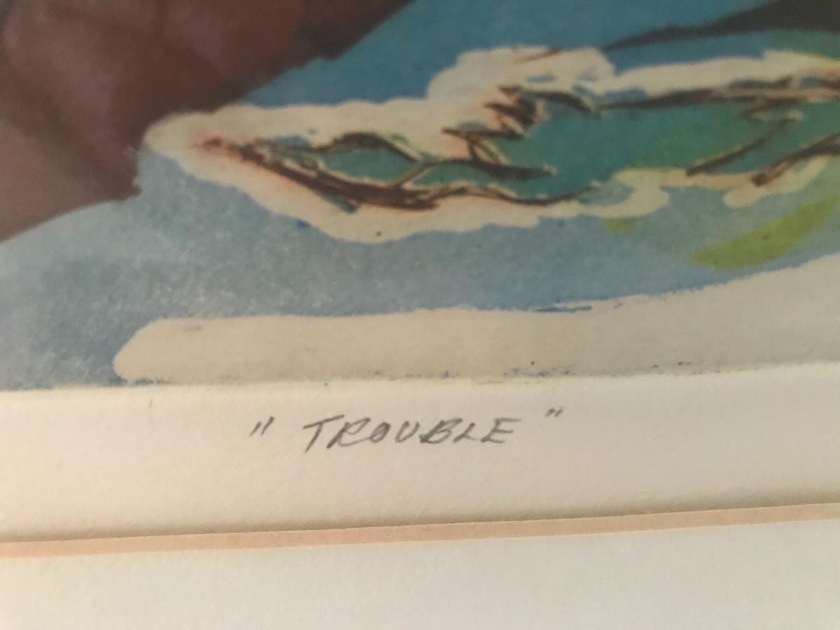 Cat picture titled "Trouble", framed and signed with original purchase receipt. 28x26. Please see all pictures for content of the lot, condition of the lot, and measurements if taken. Pictures are the best representation of the items listed and items are untested unless indicated in description. Thank you for looking and have fun bidding!