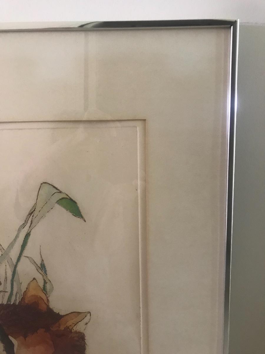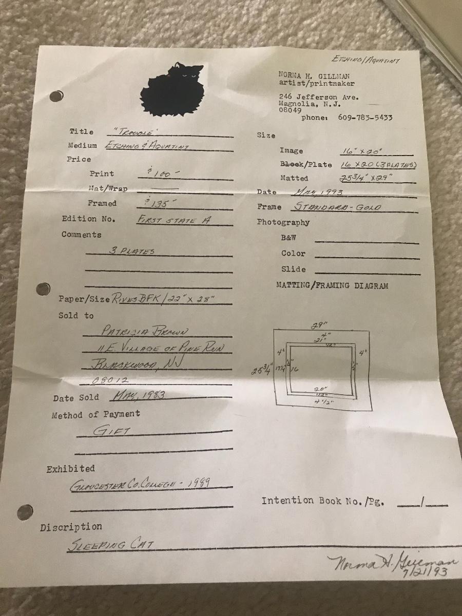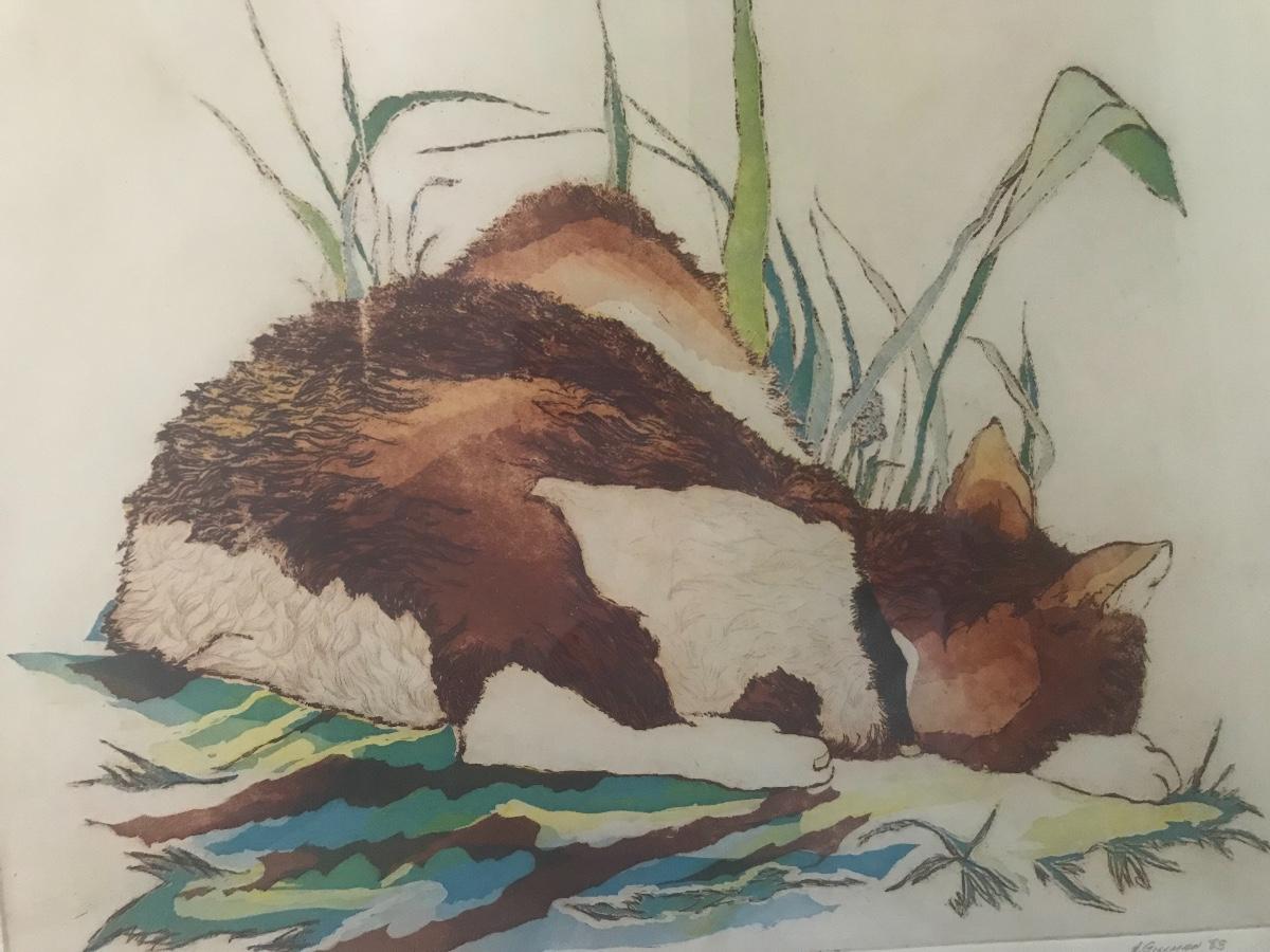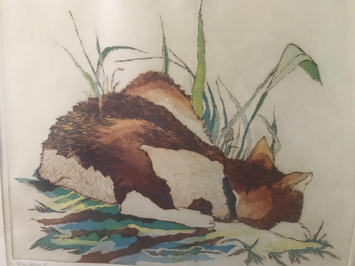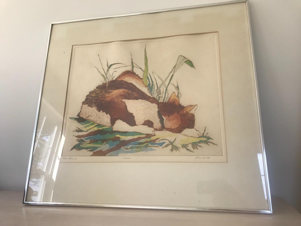 Cat picture titled "Trouble", framed and signed with original purchase receipt. 28x26. Please see all pictures for content of the lot, condition of the lot, and measurements if taken. Pictures are the best representation of the items listed and items are untested unless indicated in description. Thank you for looking and have fun bidding!