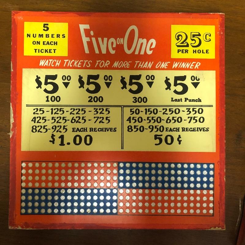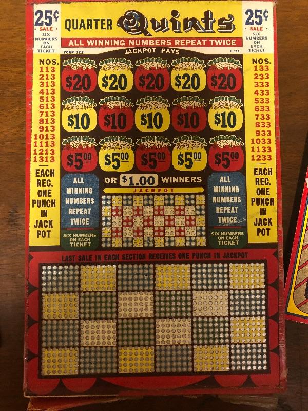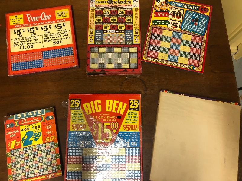 6 boards: Five on one, state special, quarter quints, Professor Charlie, Big Ben (partially sealed), lulu bell (paper wrapped_): Vintage used condition