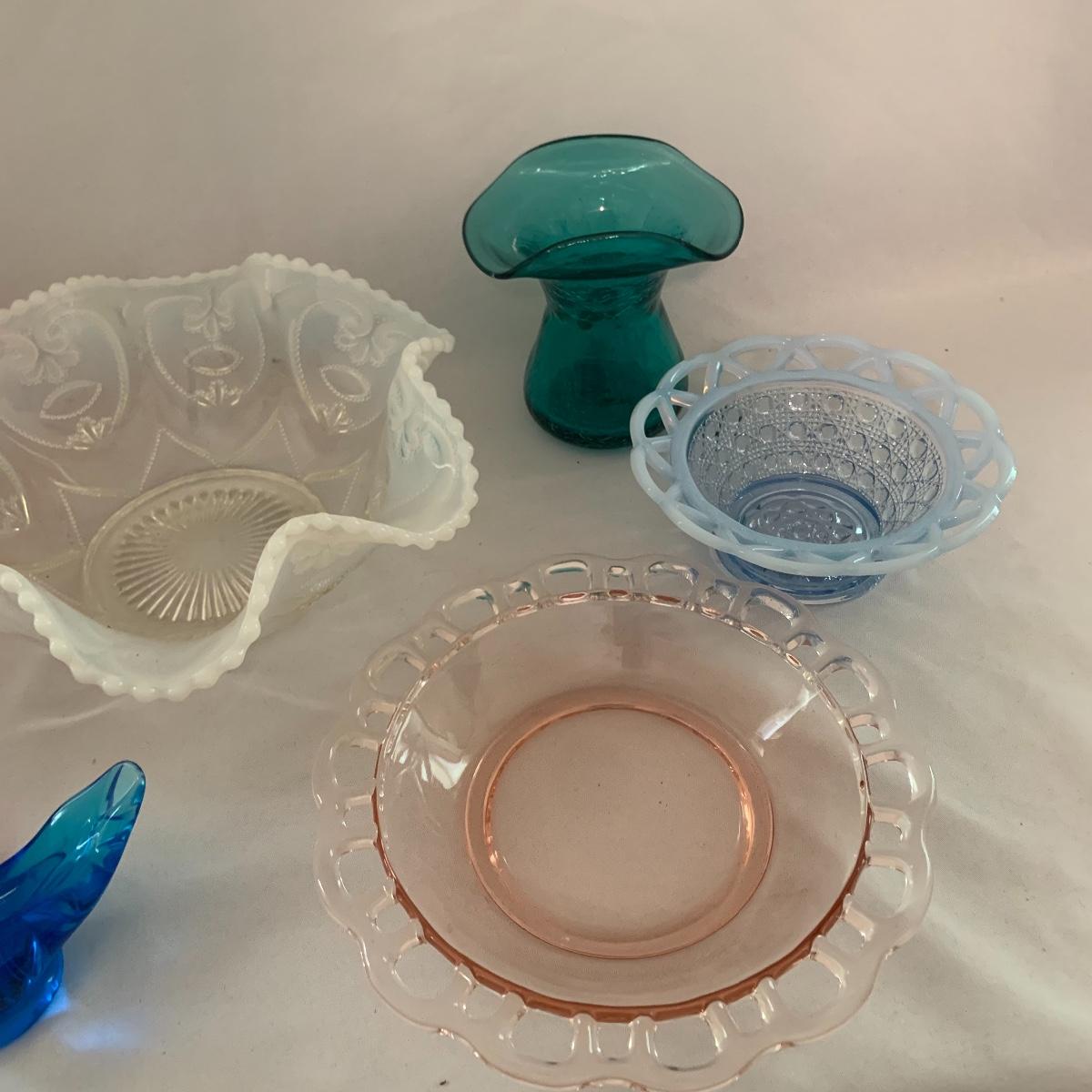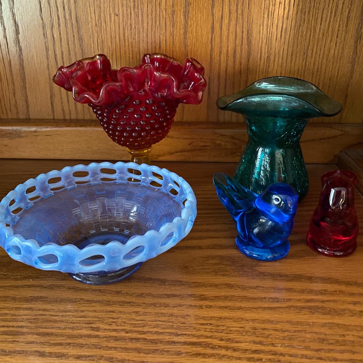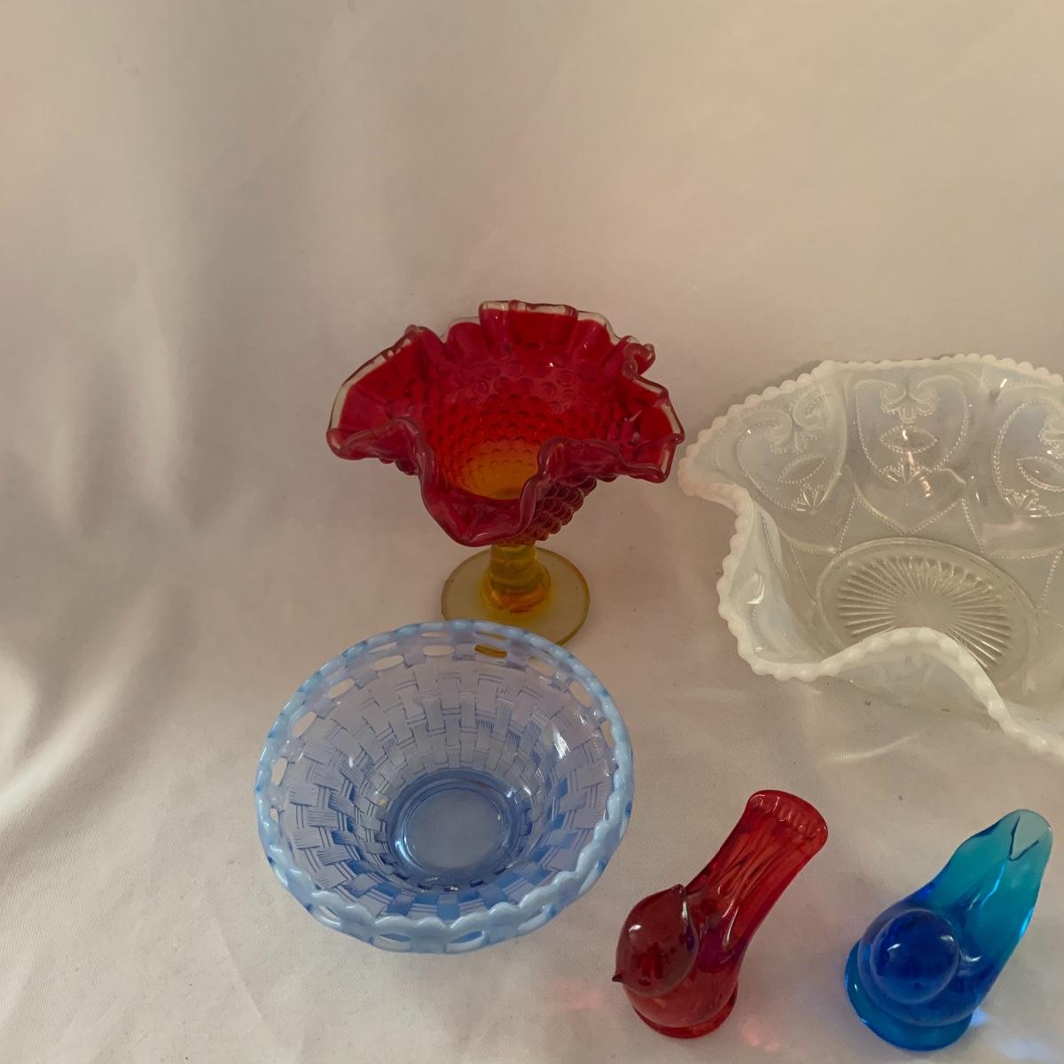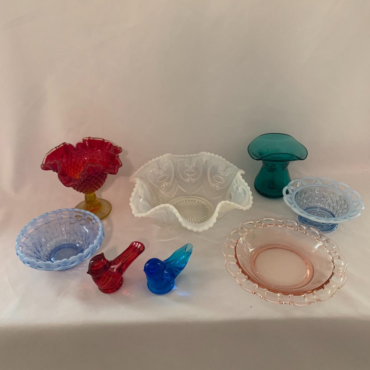 Bring a splash of color to your home with this group of beautiful glass pieces. This lot includes two candy dishes, one is clear with white trim, and the other is a gorgeous deep red. There are also three bowls, two blue and one pretty pink. Next is a turquoise vase hand made by Rainbow of West Virginia. Last are two adorable little glass birds that are both signed. The red one says Ron Ray 1993 and the blue is signed Leonard 1996. See pics for sizes. All theses pieces are in great condition. Shipping available