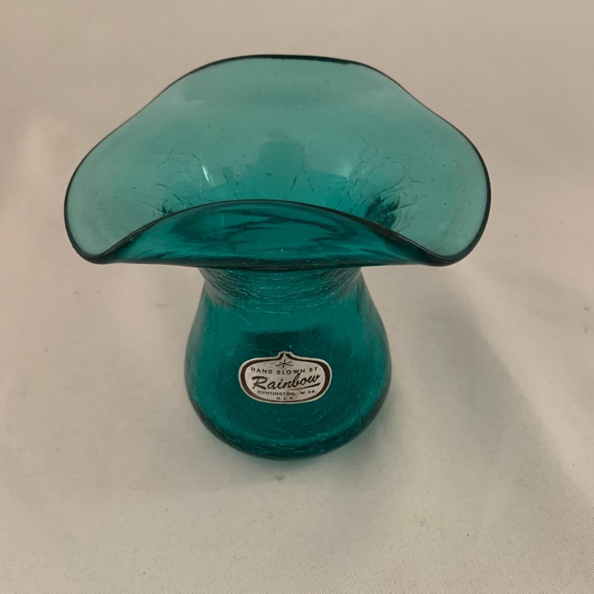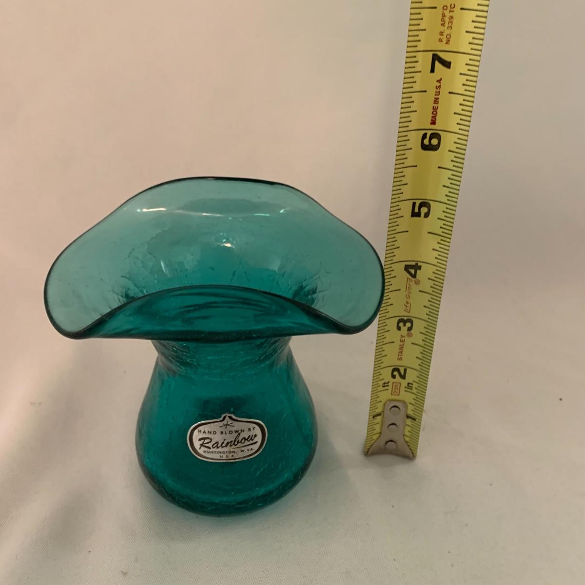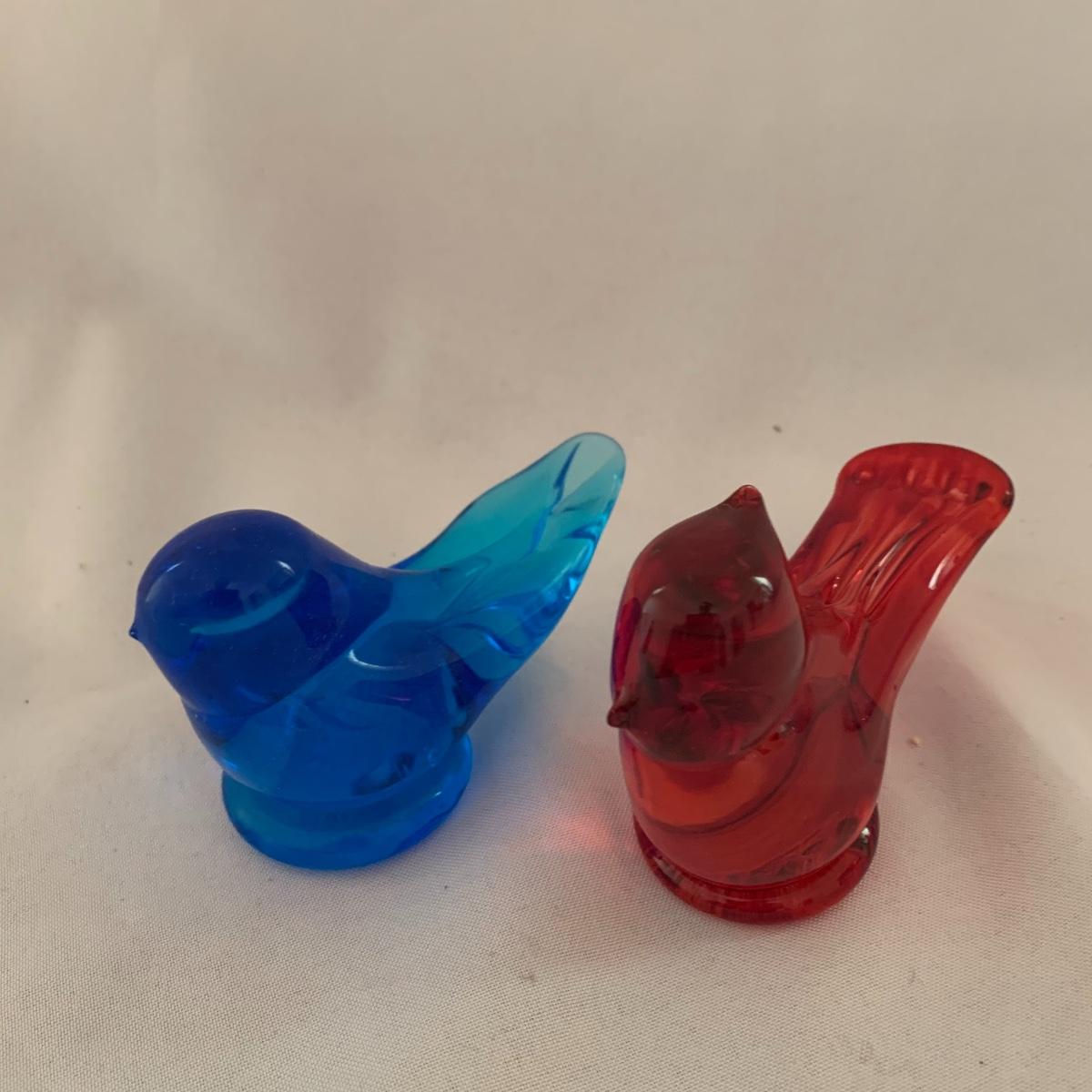 Bring a splash of color to your home with this group of beautiful glass pieces. This lot includes two candy dishes, one is clear with white trim, and the other is a gorgeous deep red. There are also three bowls, two blue and one pretty pink. Next is a turquoise vase hand made by Rainbow of West Virginia. Last are two adorable little glass birds that are both signed. The red one says Ron Ray 1993 and the blue is signed Leonard 1996. See pics for sizes. All theses pieces are in great condition. Shipping available