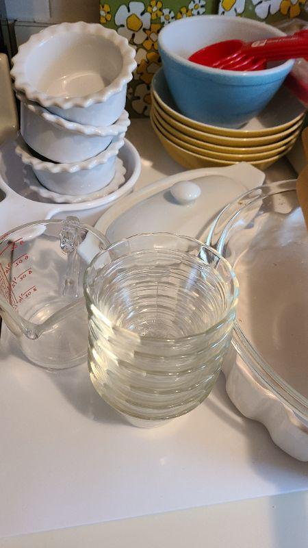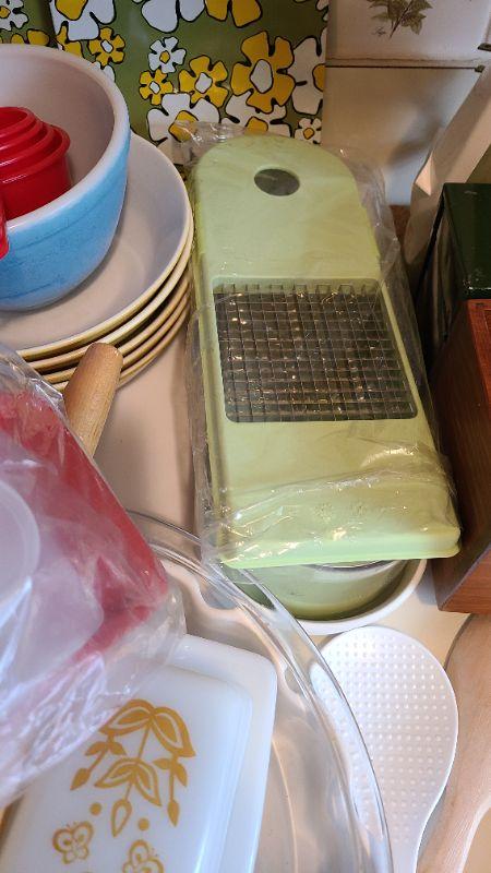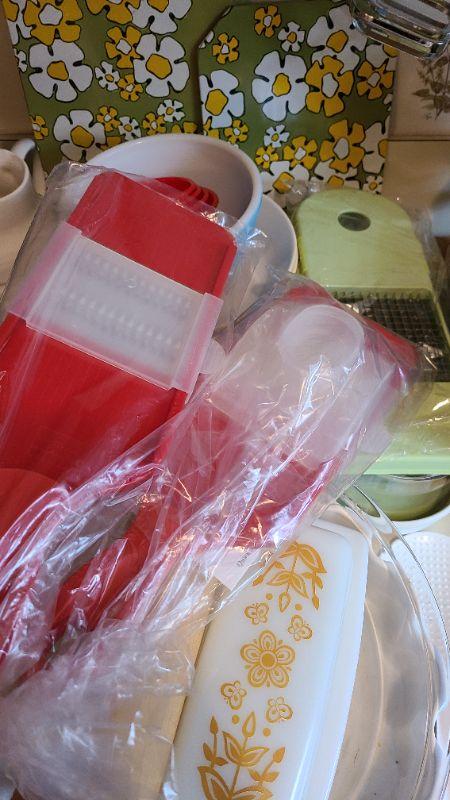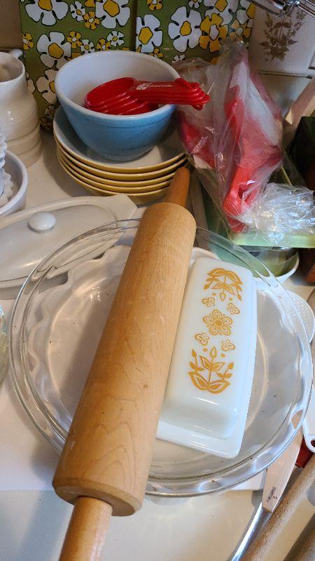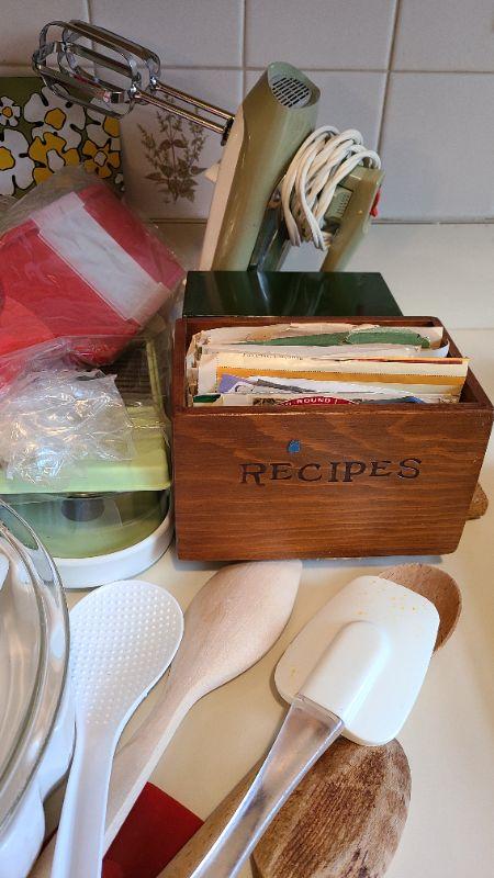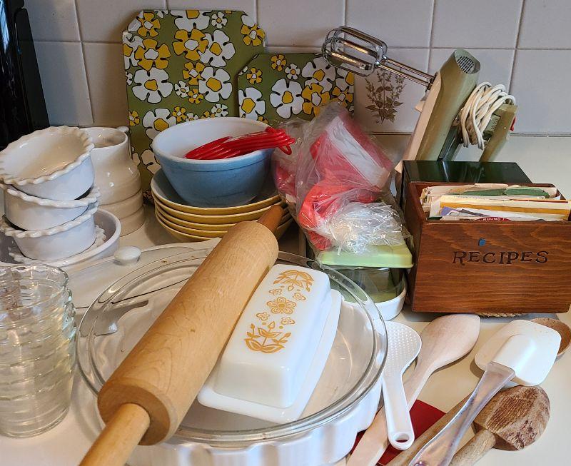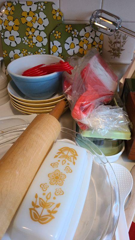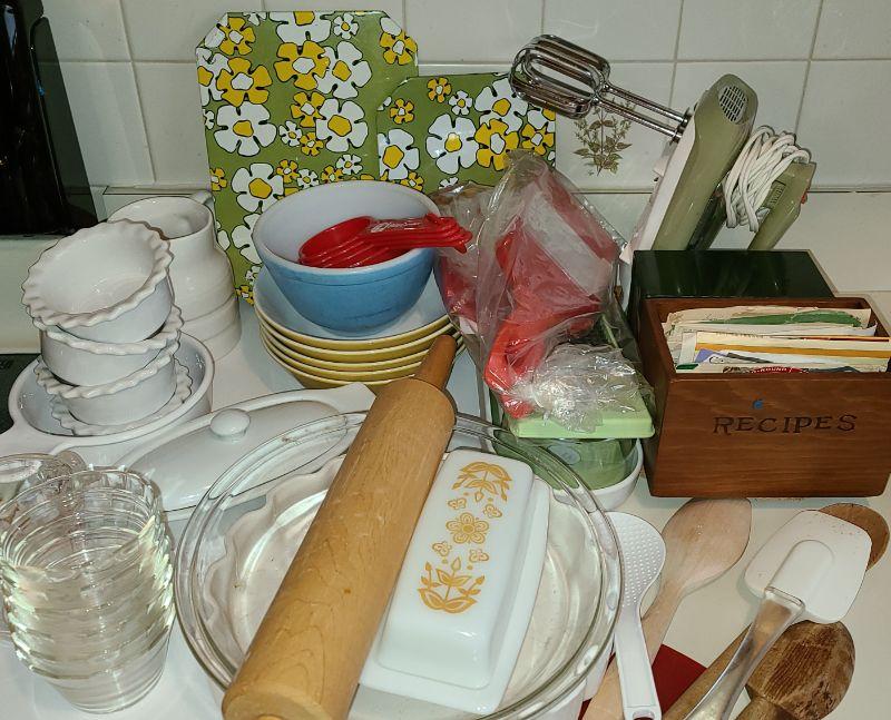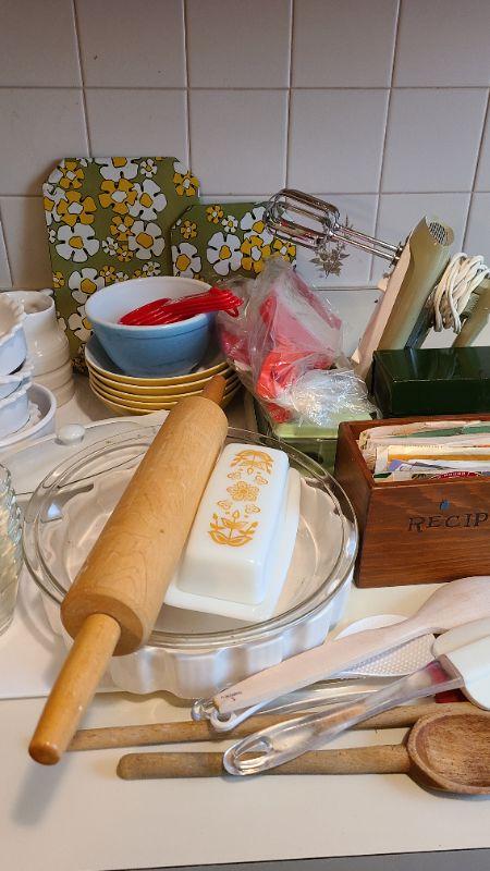 Large lot of kitchen items for baking. Including two recipe boxes, pyrex butter dish, pyrex mixing bowl, vintage floral hotplates, a GE mixer, pyrex ramekins, rolling pin, mandolin and more! CLS