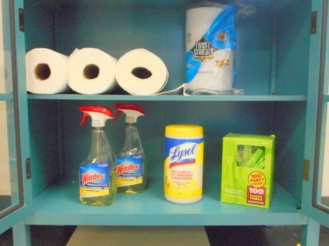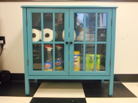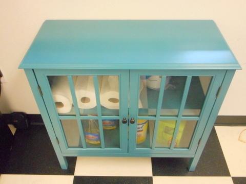 Lot 106 - Blue Wooden Cabinet with Glass Pane Doors + Cleaning Products