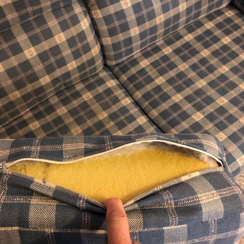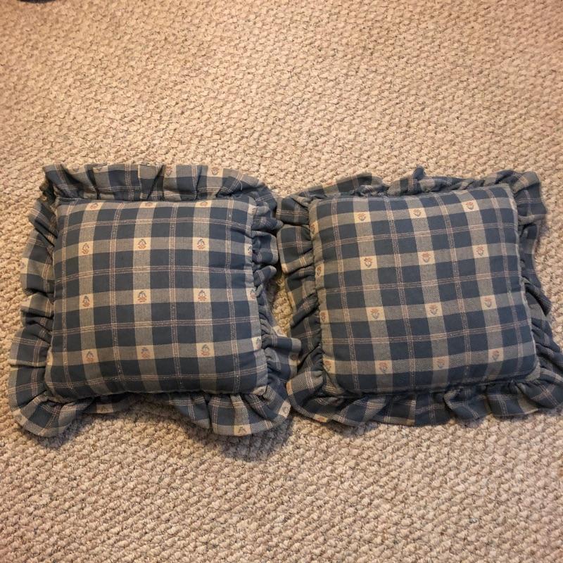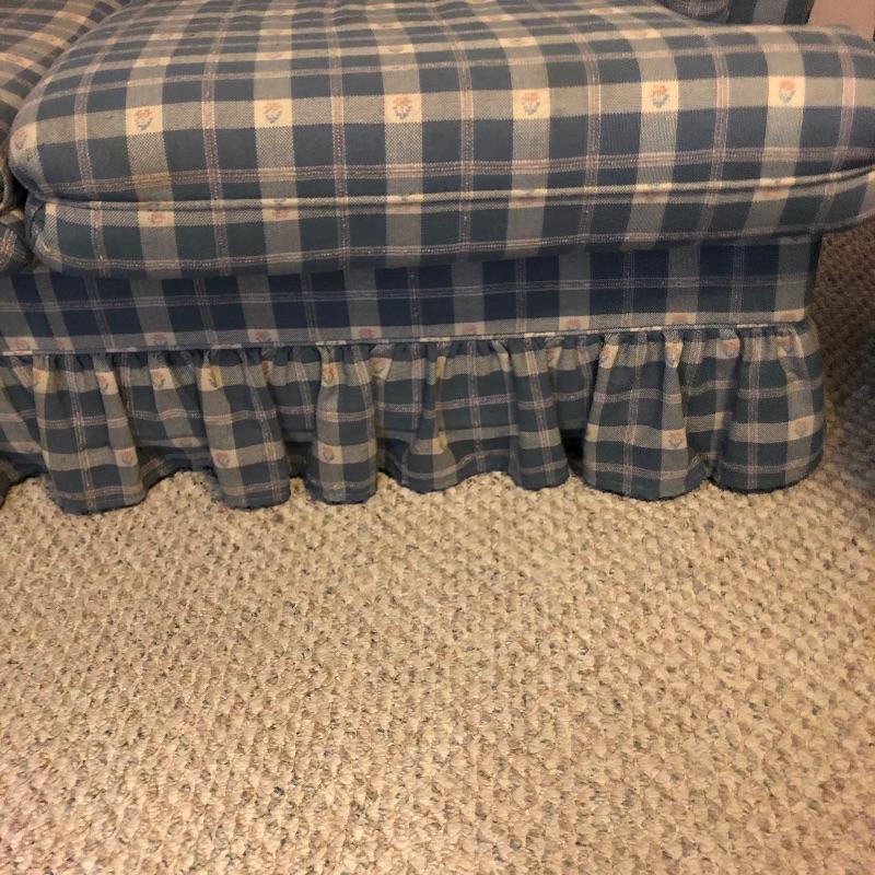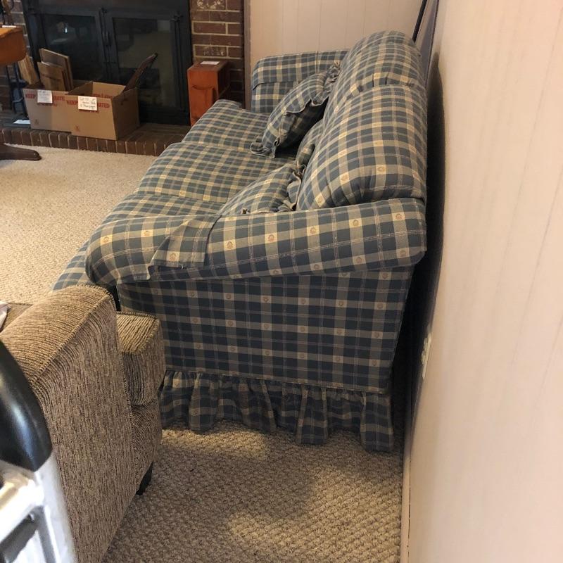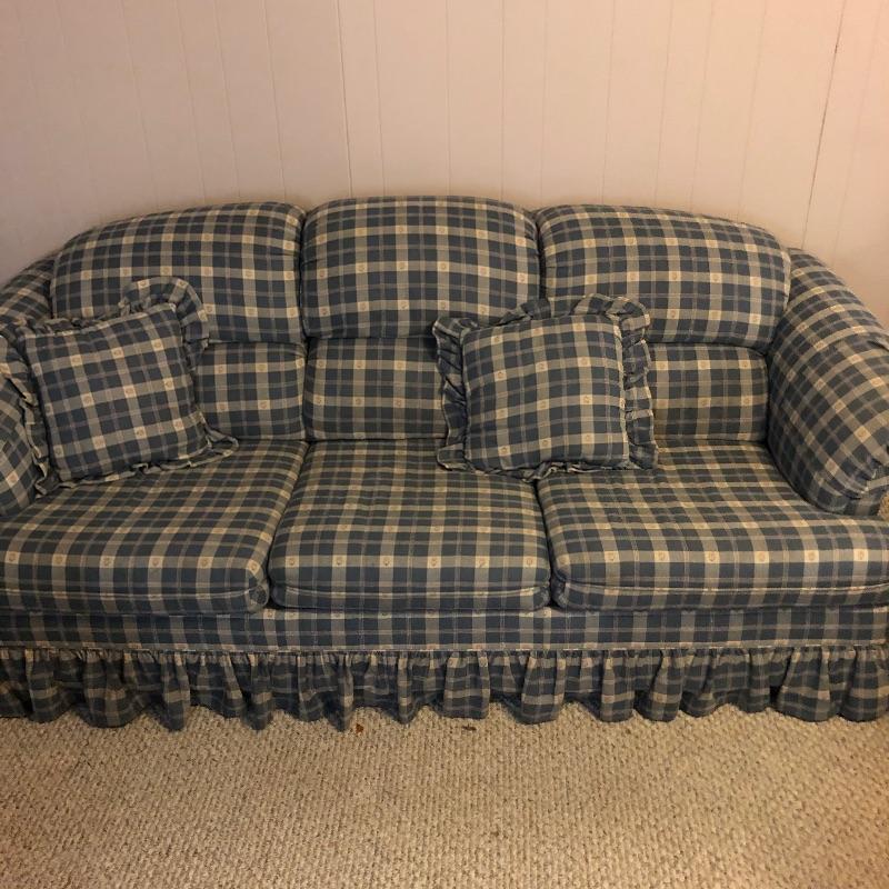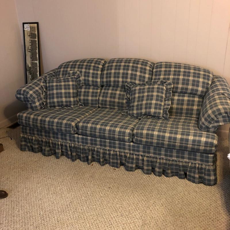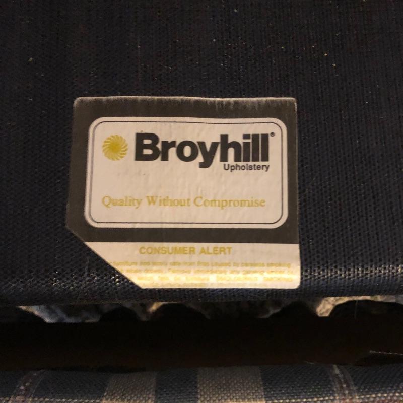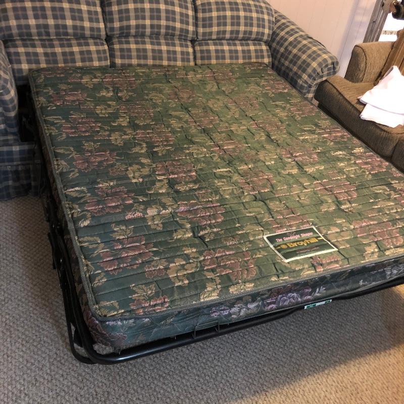 This very comfortable Broyhill sleeper sofa is in good shape. Fabric is a checked medium blue color with removable seat cushions and two additional matching pillows. The bed pulls out with ease and the mattress appears to be in excellent shape and measures 60” x 71”. Matching armchair in Lot 83.