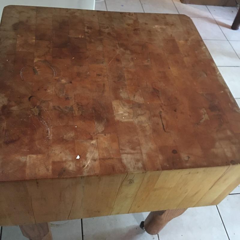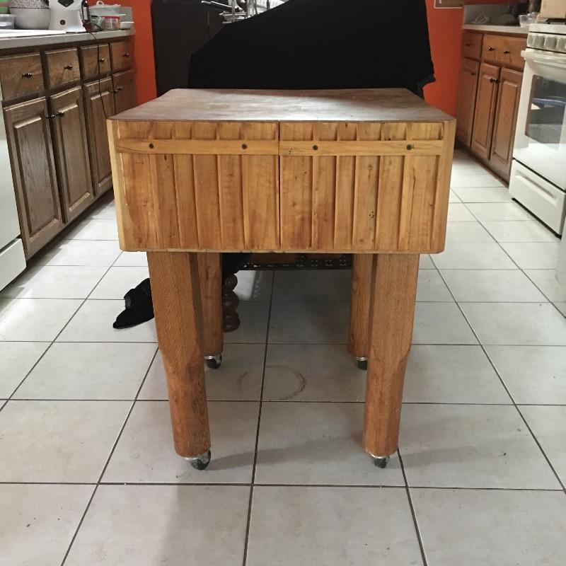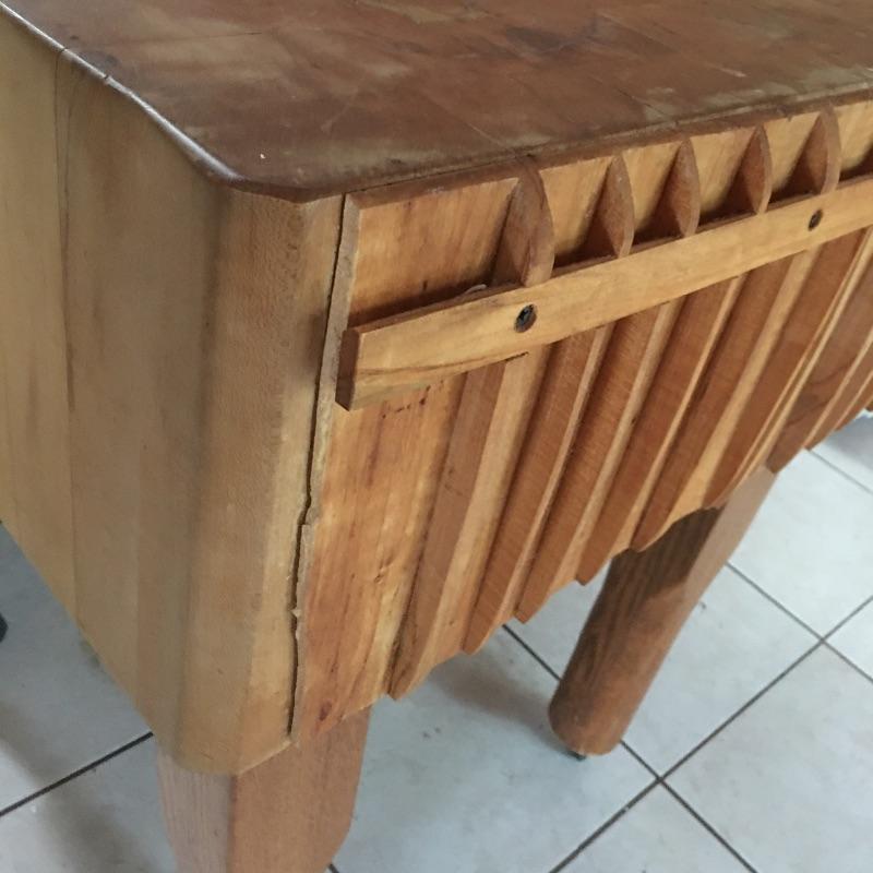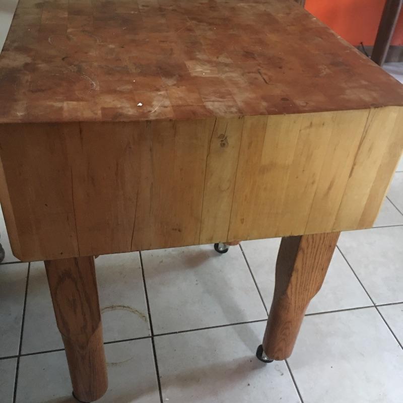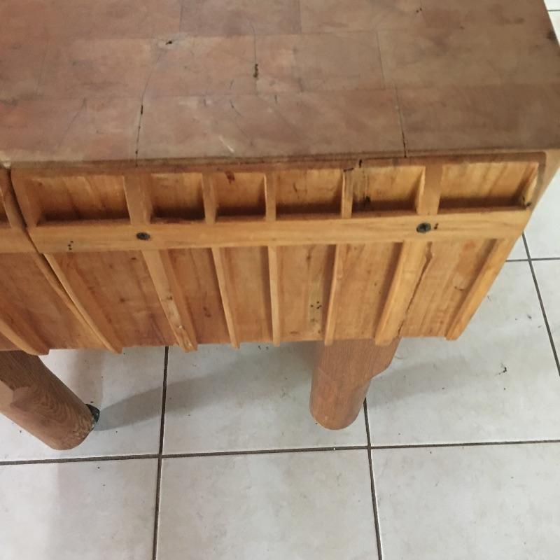 Stunning solid butcher block table on wheels with knife holder on one side. This table is built to last a few lifetimes with its 9.5” thick block. Table has scratches and discoloring on top that just adds to the character. The end of knife holder is broken off, see pictures.