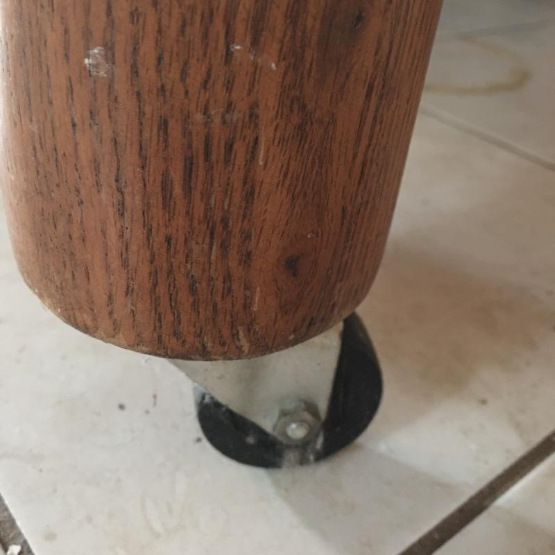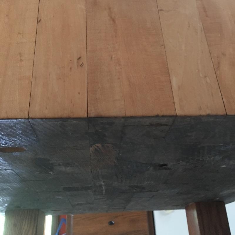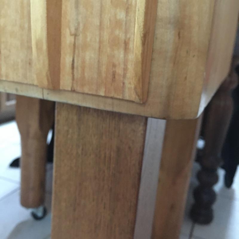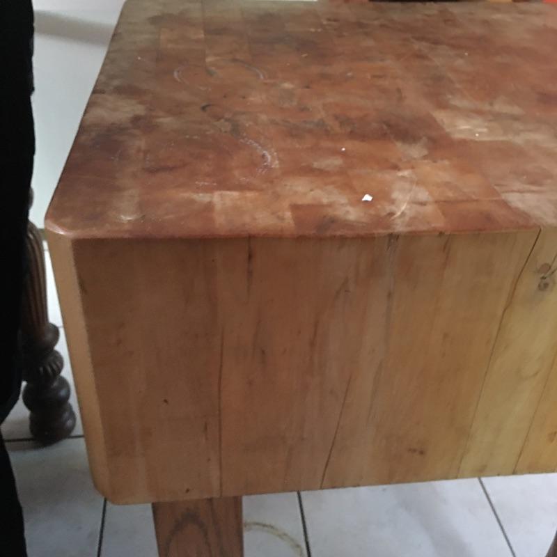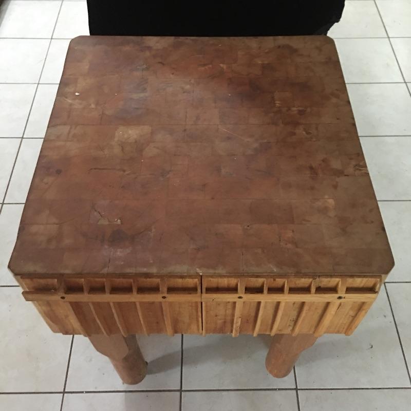 Stunning solid butcher block table on wheels with knife holder on one side. This table is built to last a few lifetimes with its 9.5” thick block. Table has scratches and discoloring on top that just adds to the character. The end of knife holder is broken off, see pictures.