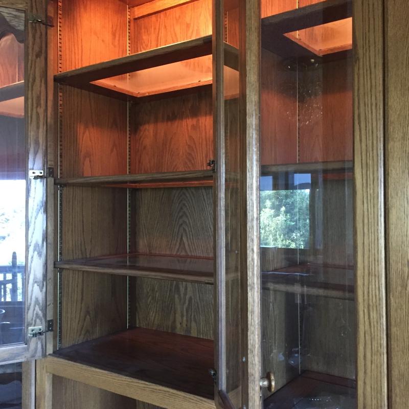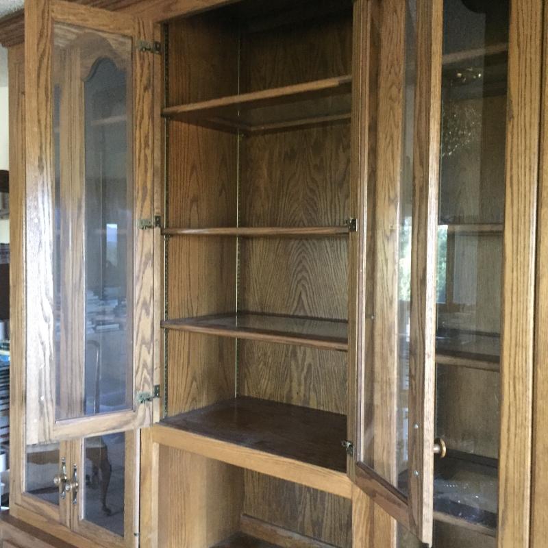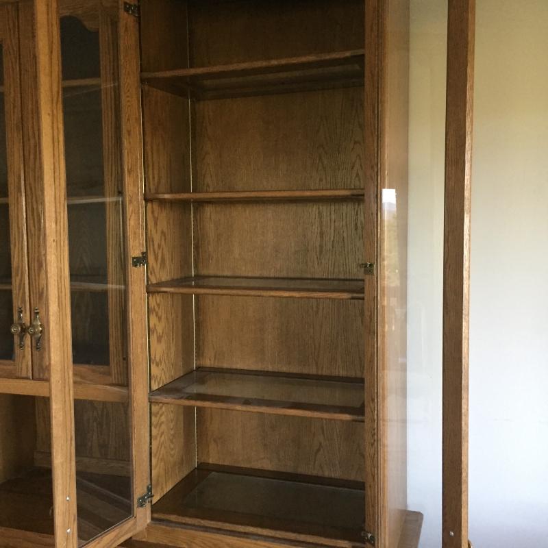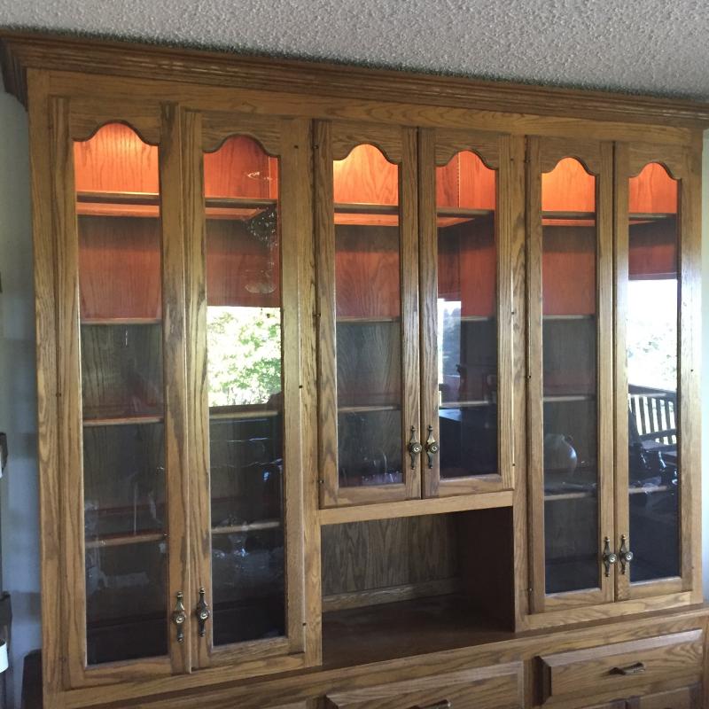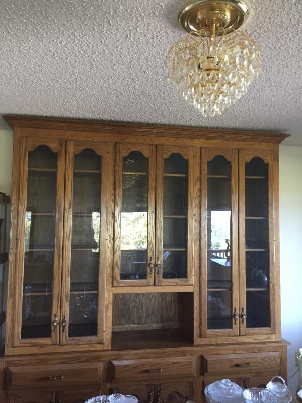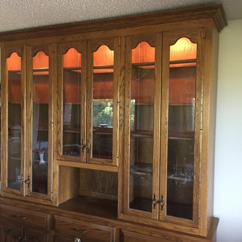 Statement custom made China Cabinet. Has two extra shelves which are wood with glass inserts in the top cabinets. Great for all your Heirlooms.