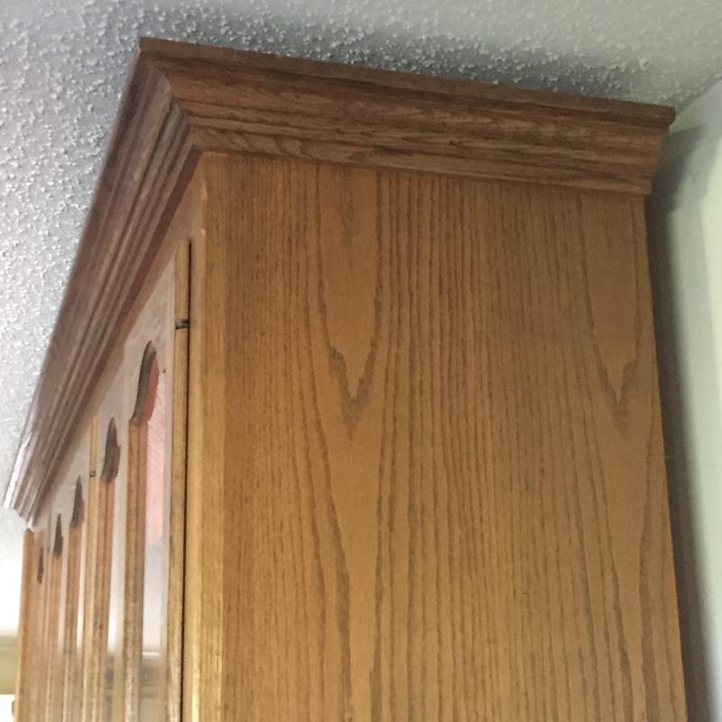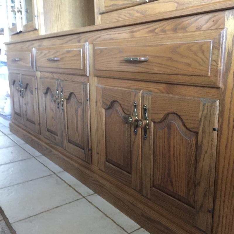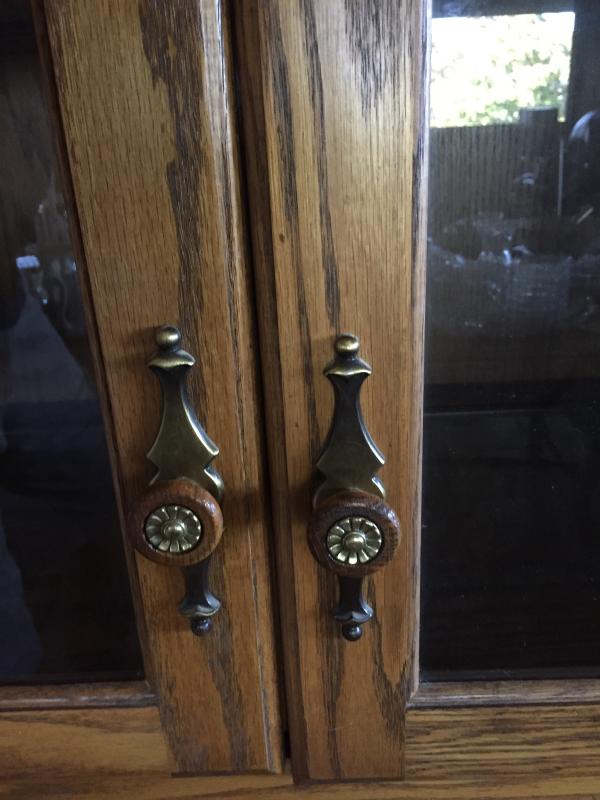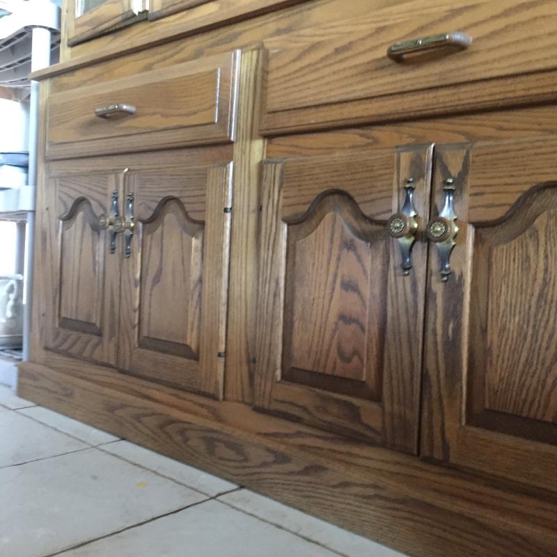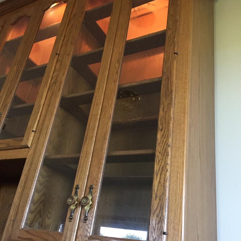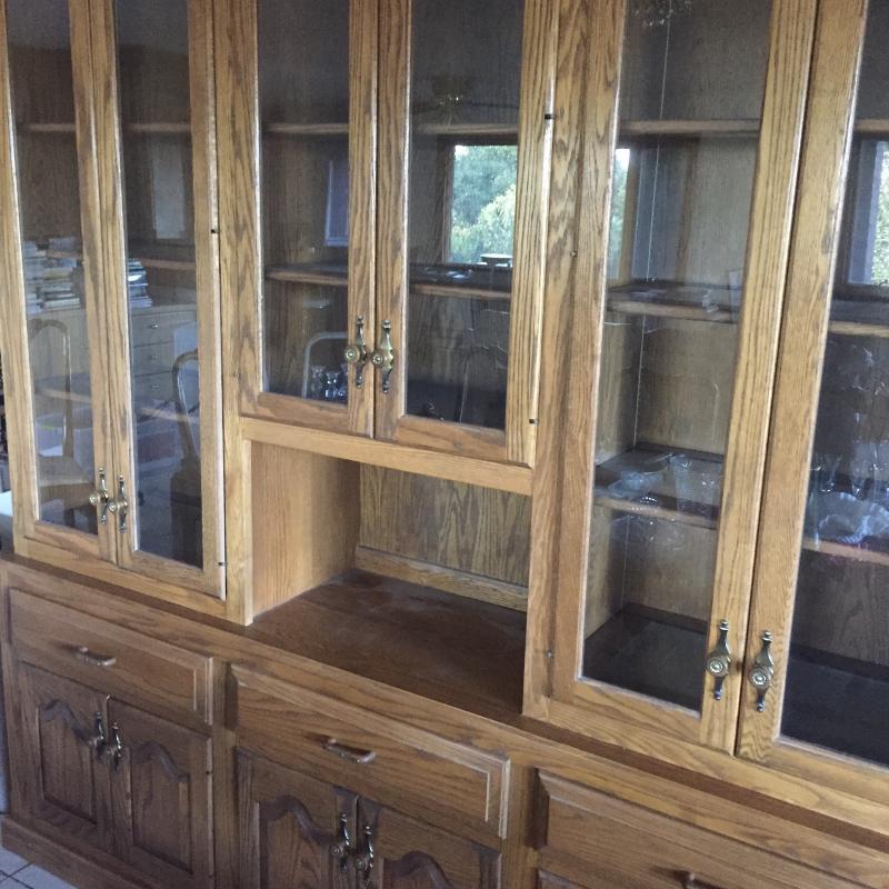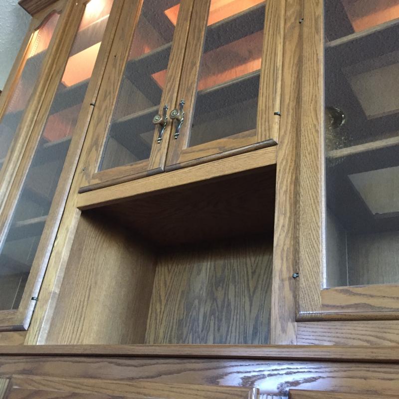 Statement custom made China Cabinet. Has two extra shelves which are wood with glass inserts in the top cabinets. Great for all your Heirlooms.