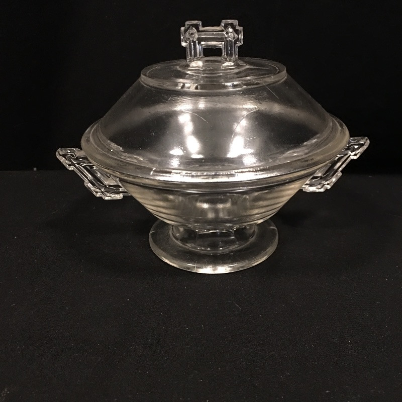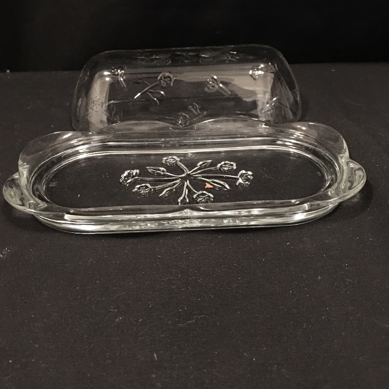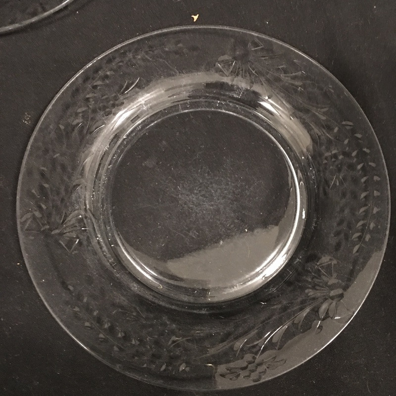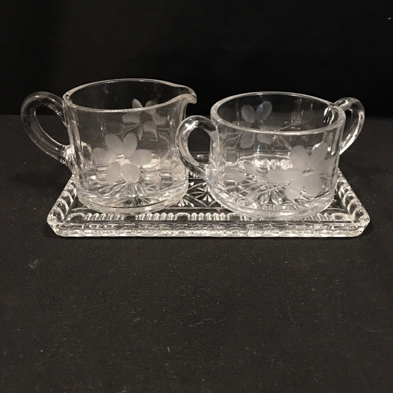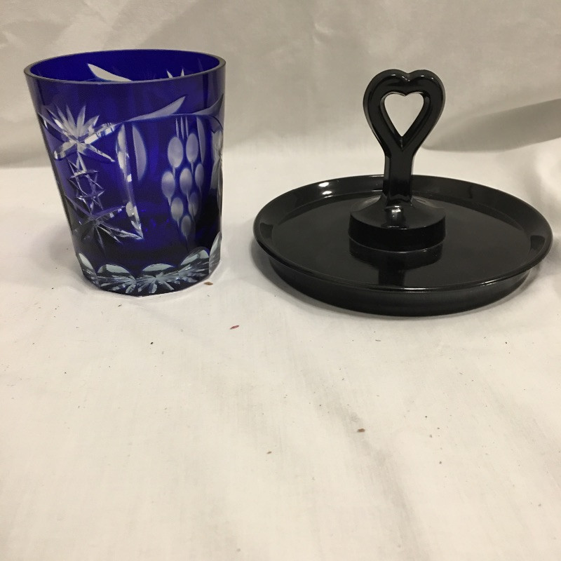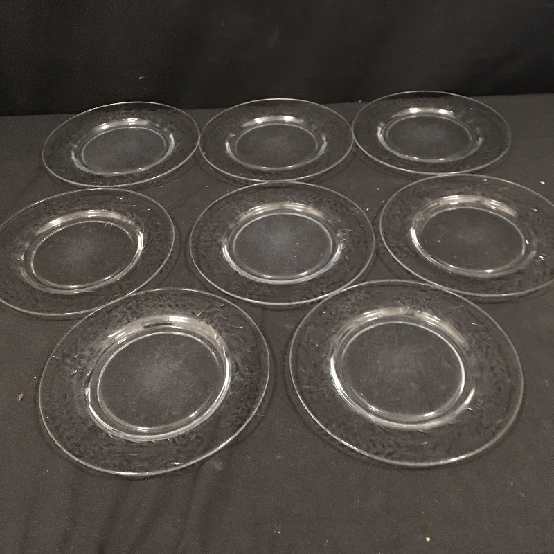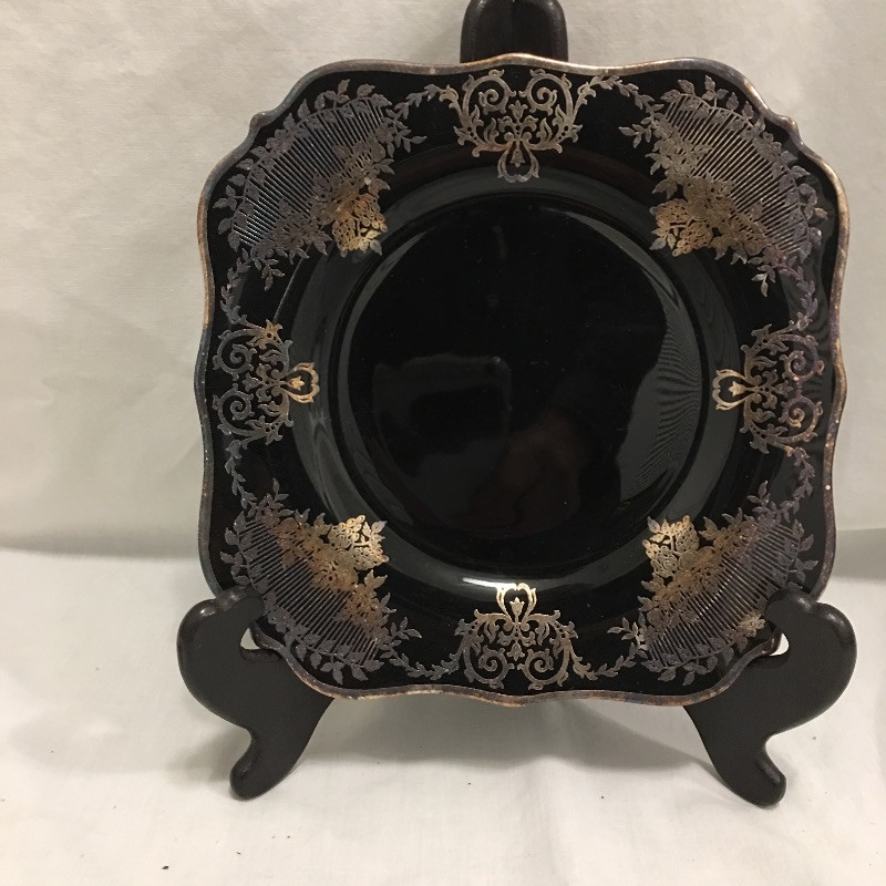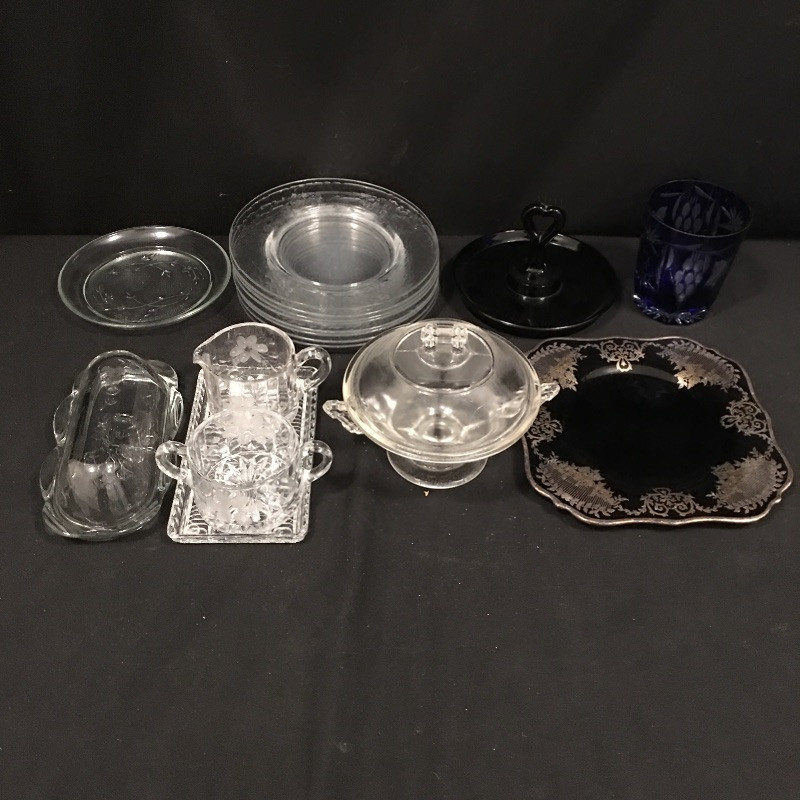 Some really unique and eye-catching glass items here that includes eight small plates, butter dish, sugar and creamer dishes, black plate, blue cup and small confectionery dish. Black plate measures 8” x 8”.