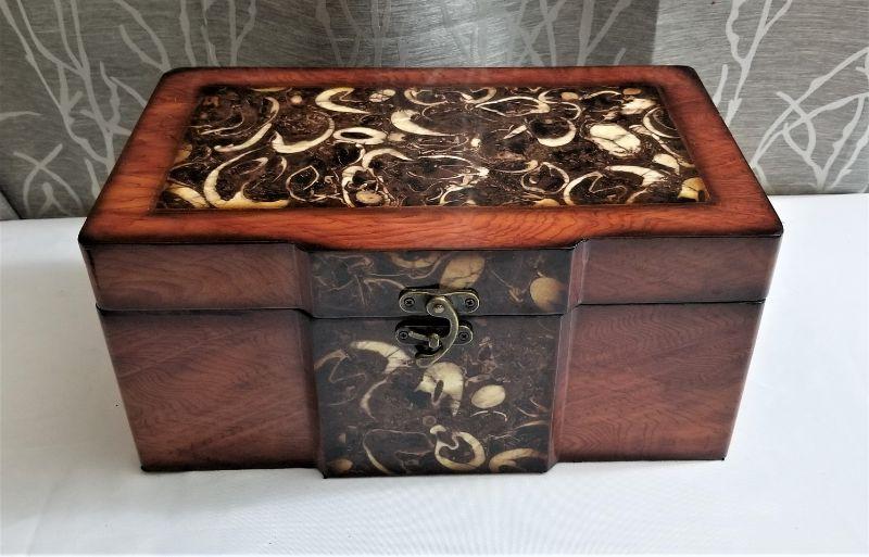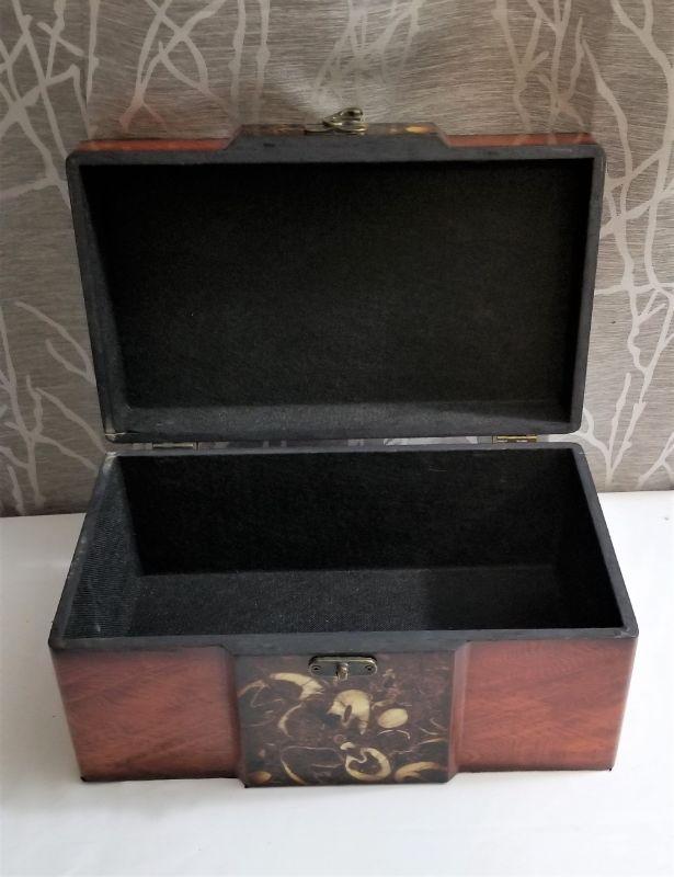Nice decorative box with clasp - gently used - high gloss finish. Use for jewelry, important documents, etc. Measures 13.5 x 8 x 6.