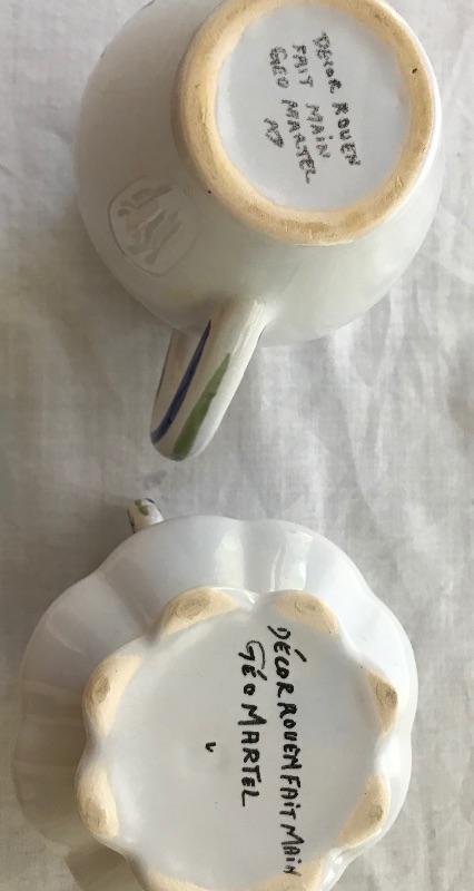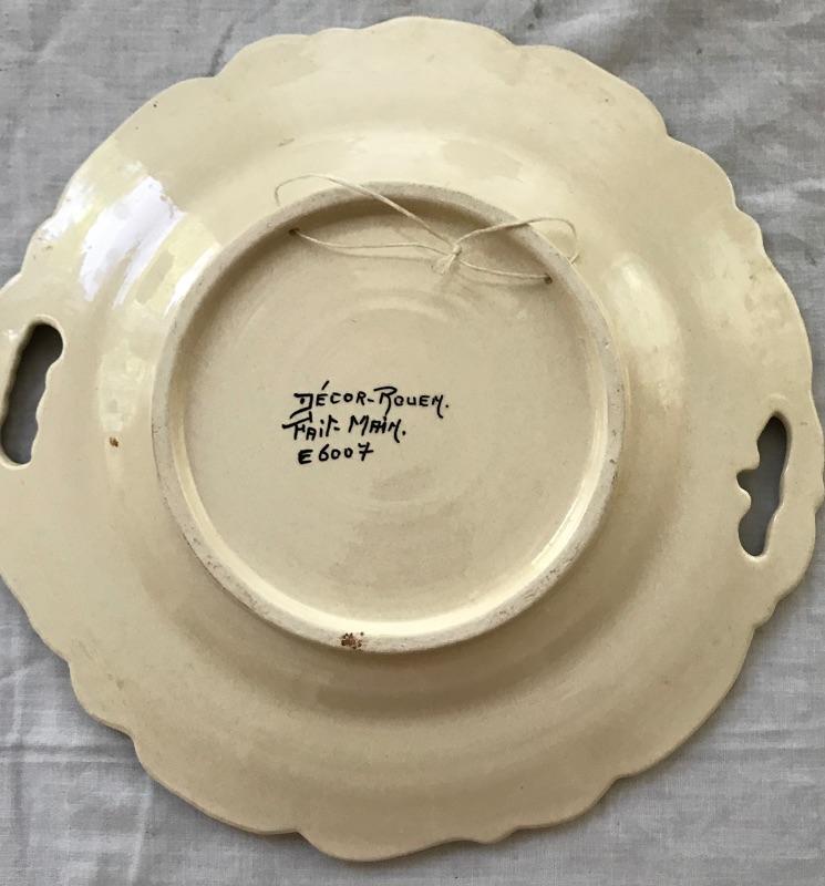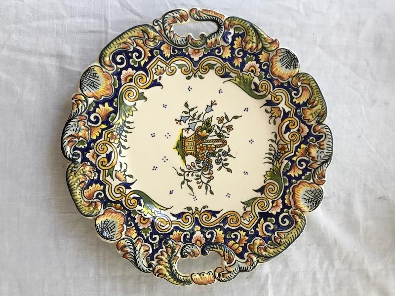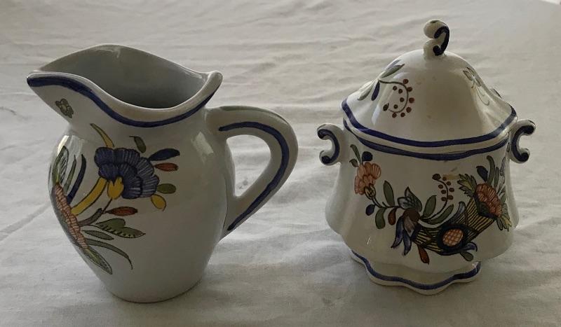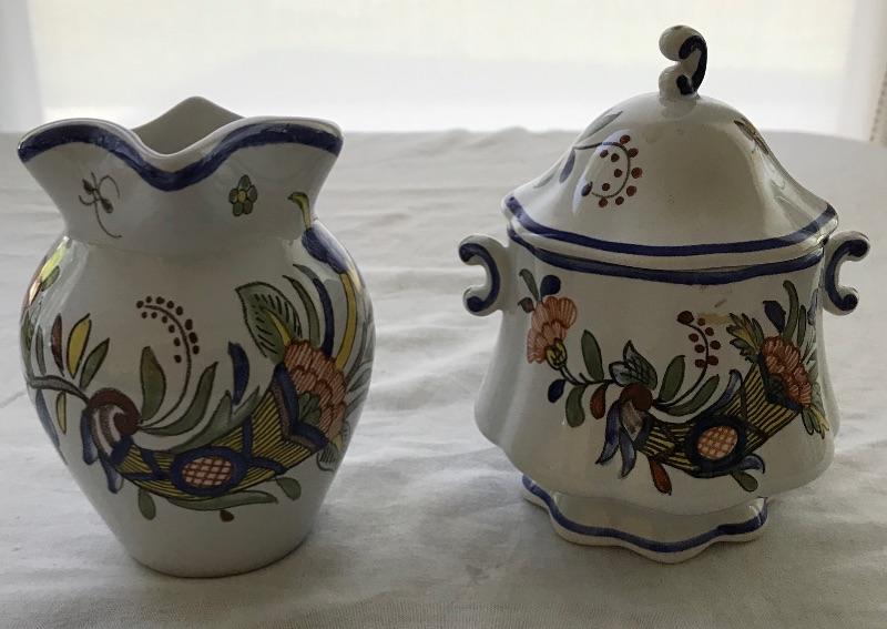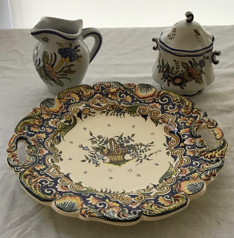 Decor Fait Main George Martel Handled Cake Plate Cream Pourer and Sugar Dish. cake plate has handles and measures 11” in diameter, sugar dish has a small chip
