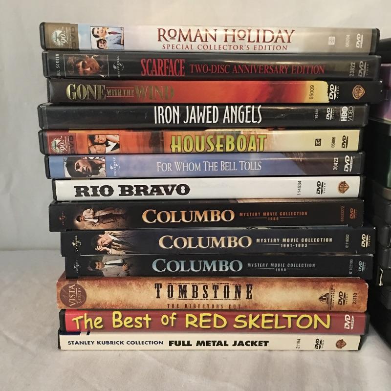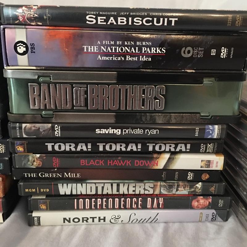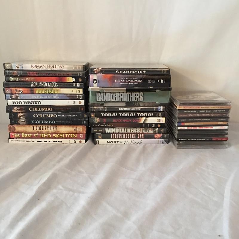 Great collection of DVDs and CDs that includes Scarface, For Whom The Bell Tolls, Tora Tora Tora, Band of Brothers, Saving Private Ryan and many more. See pictures for all titles.