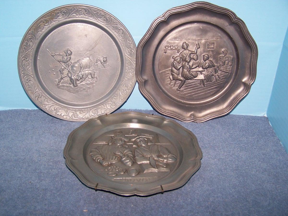 THESE ARE 3 FANCY VINTAGE EMBOSSED PEWTER PLATES!!! MARKED.. 9'' ACROSS. LIGHT WEAR..
