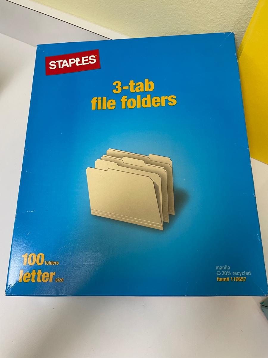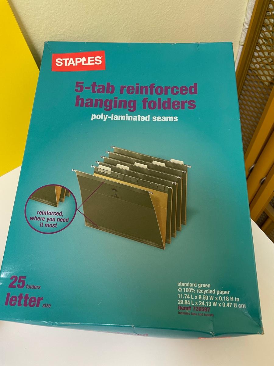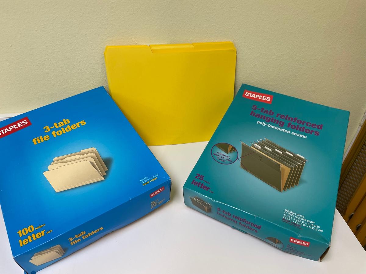 Full boxes of hanging file folders and 3 tab file folders and a few plastic file folders