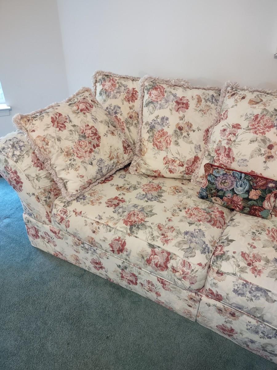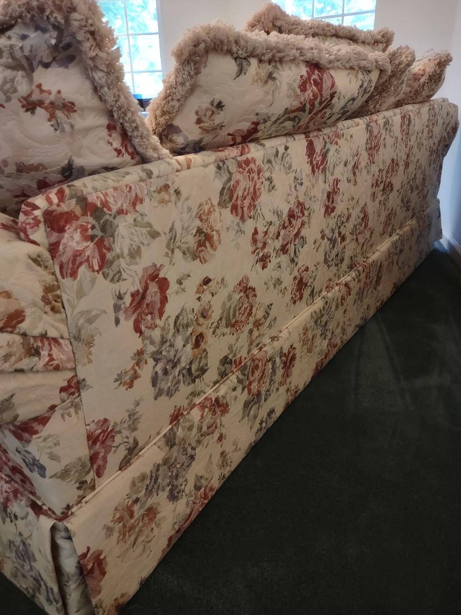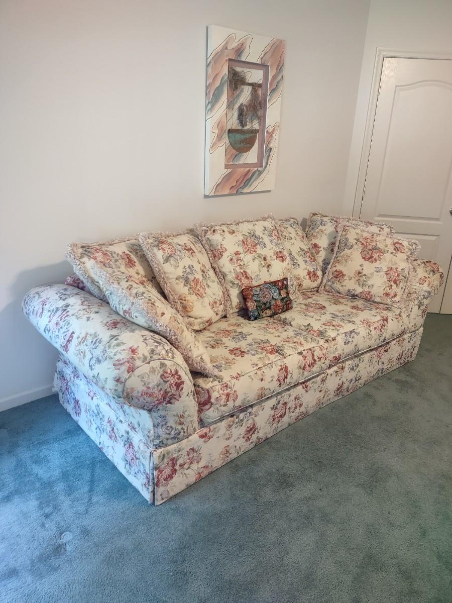 Floral Couch Very Clean & In Good Condition 98×39×28 Photo Not Included In This Lot. Please see all pictures as they are the best representation of the items. The pictures show condition, measurements if taken, and what is included in the lot. Due to the large amount that we photograph and the time frame, we are not always able to take measurements. All items unless noted, are pre-owned and have been used. If you purchased furniture, you must bring help. We do not allow one person to carry large furniture out on their own. Bring help, tools and a truck for the safety of our client’s homes, and your personal safety. Company policy. Thank you.