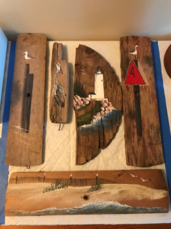 All four pieces are signed L. Amtmann and numbered. Beach scene #43, Lighthouse #31, Bird standing on post #1 and Bird standing on sign #2. Great Blue Heron is not signed and may be by a different artist