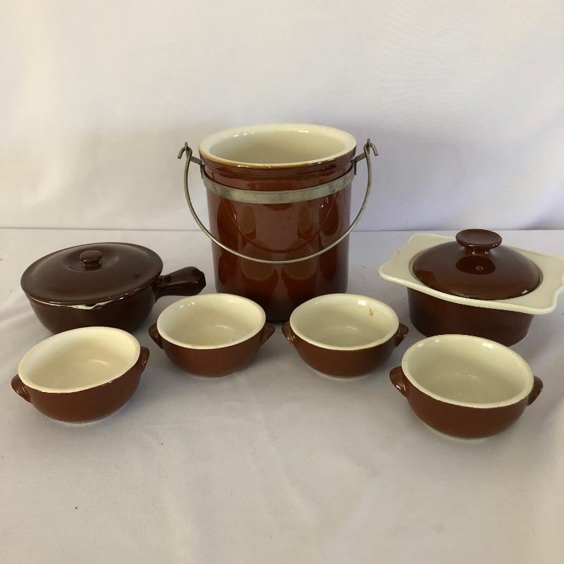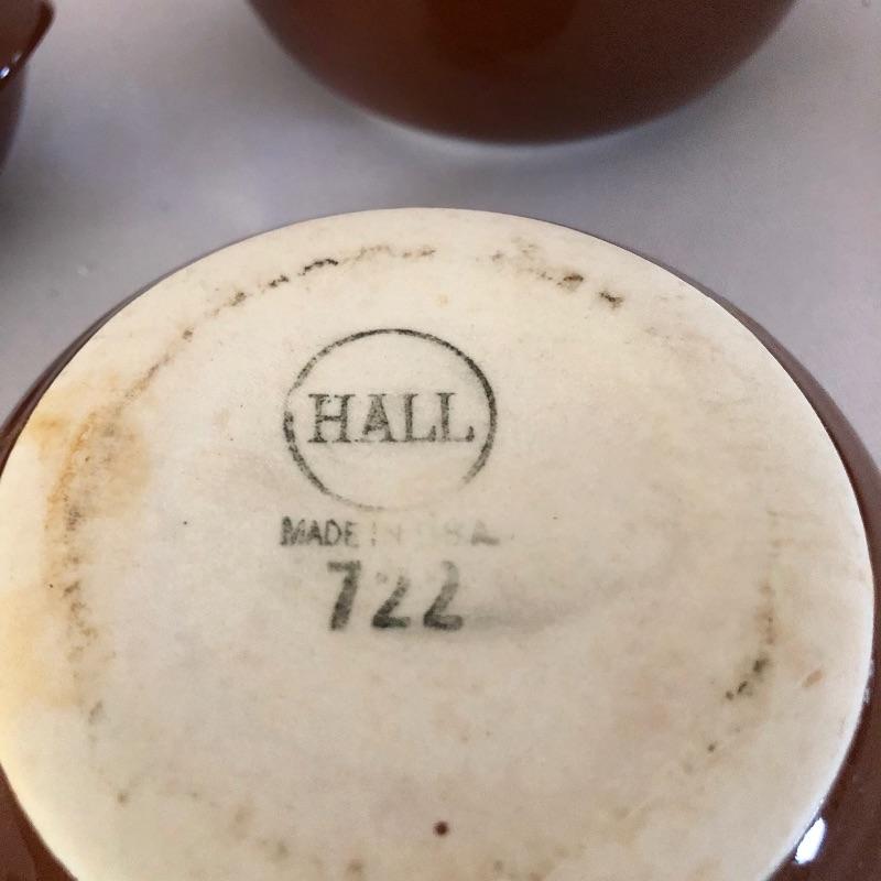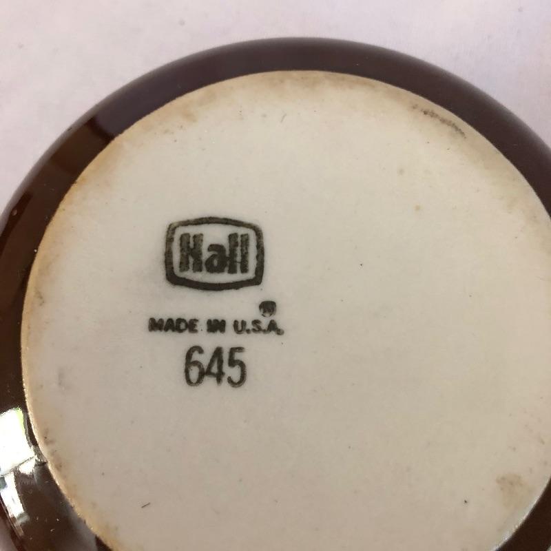 Assortment of various Hall crocks and more here that includes four small ramekins, two lidded crocks and a utensil holder that measures 7”. See images for all the markings on the bases of the pieces.