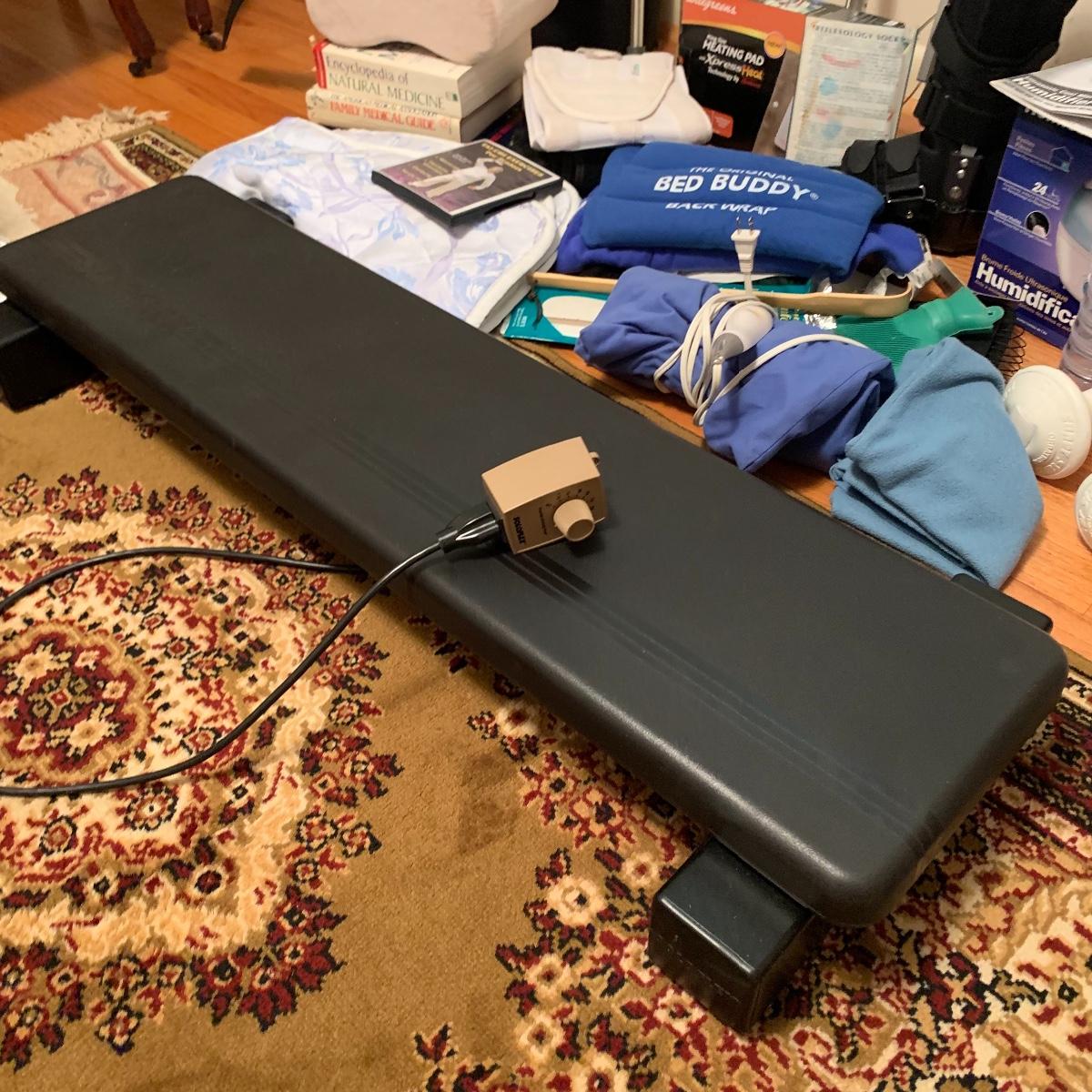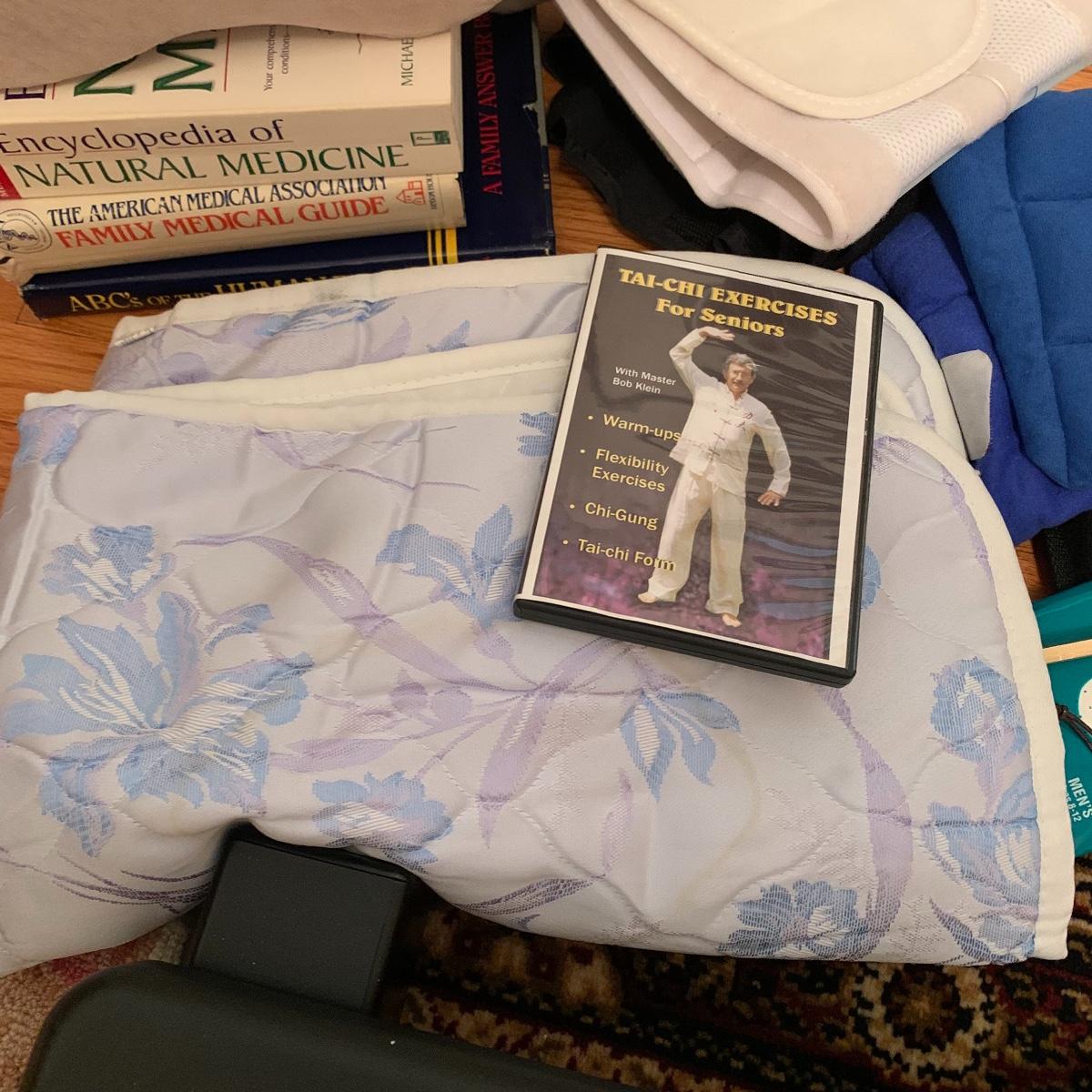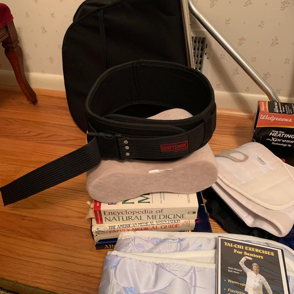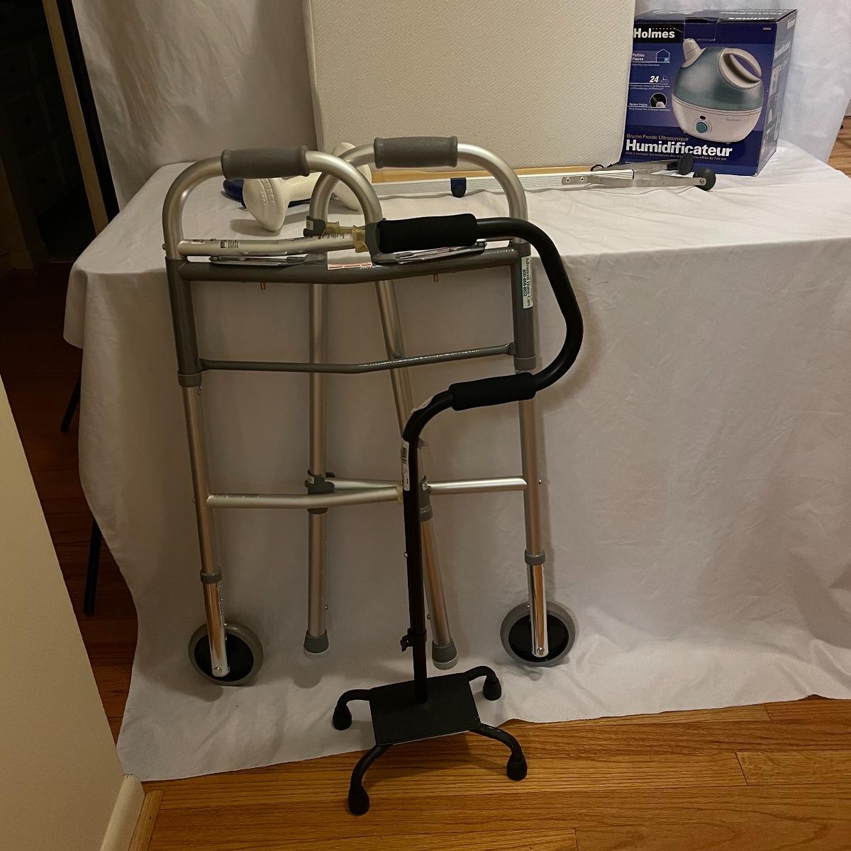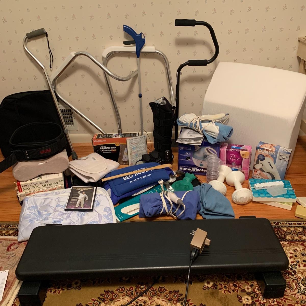 This is an extensive home health lot with lots to offer! Included are health books, a walker, weight belts, two walking canes, a new heating pad, several beaded back wraps, a leg brace, a new humidifacateur, a new consortium massager, a leg pillow, a set of 3.3 lb weights, and more. However the true star of this show is a Soloflex WBV vibrating exercise pad. This item is clean, and in good working condition! It even comes with a manual. See images. black cane and walker stand about 33 high, both are adjustable. Memory foam pillow is roughly 21” x 22” x 7.5”. Local pickup only.