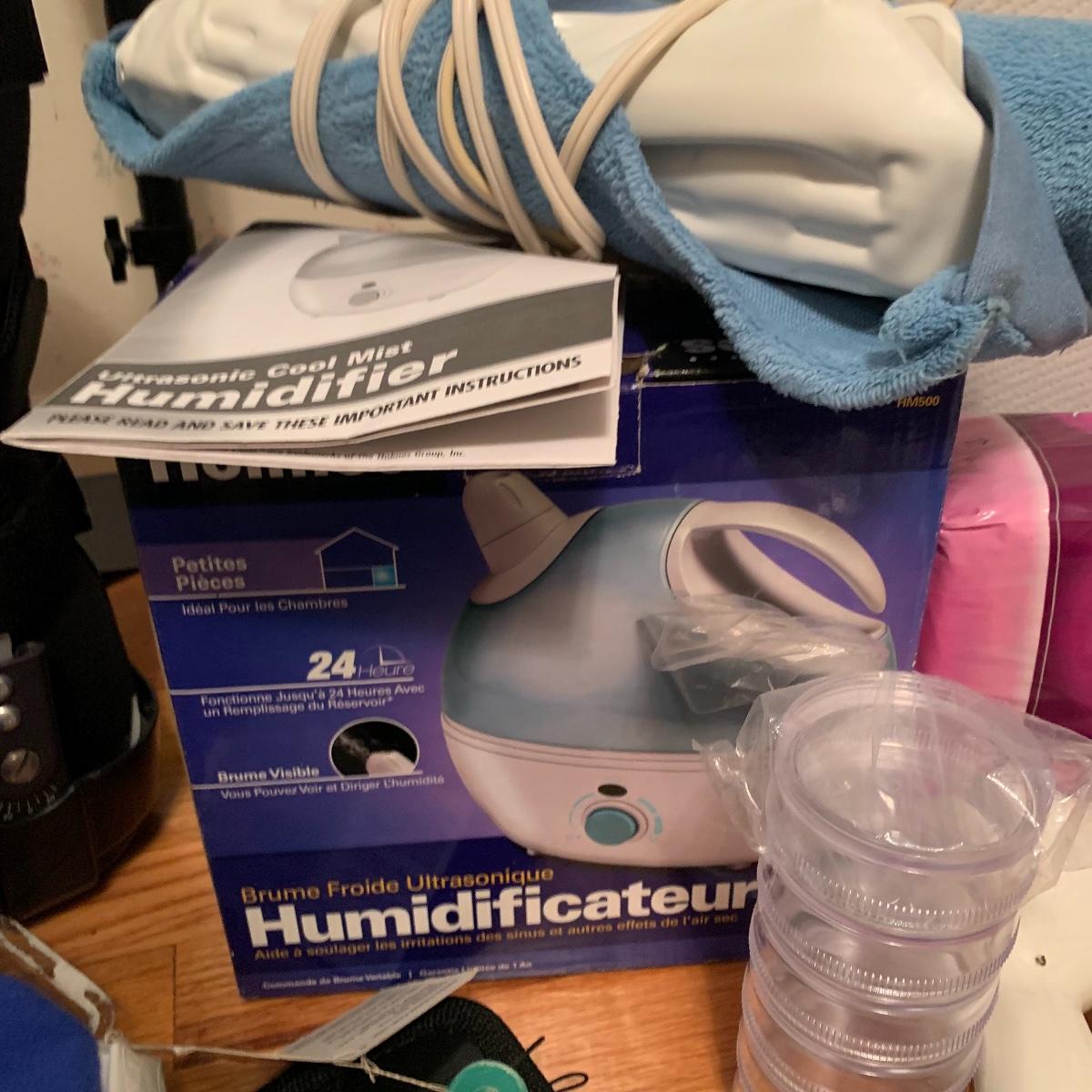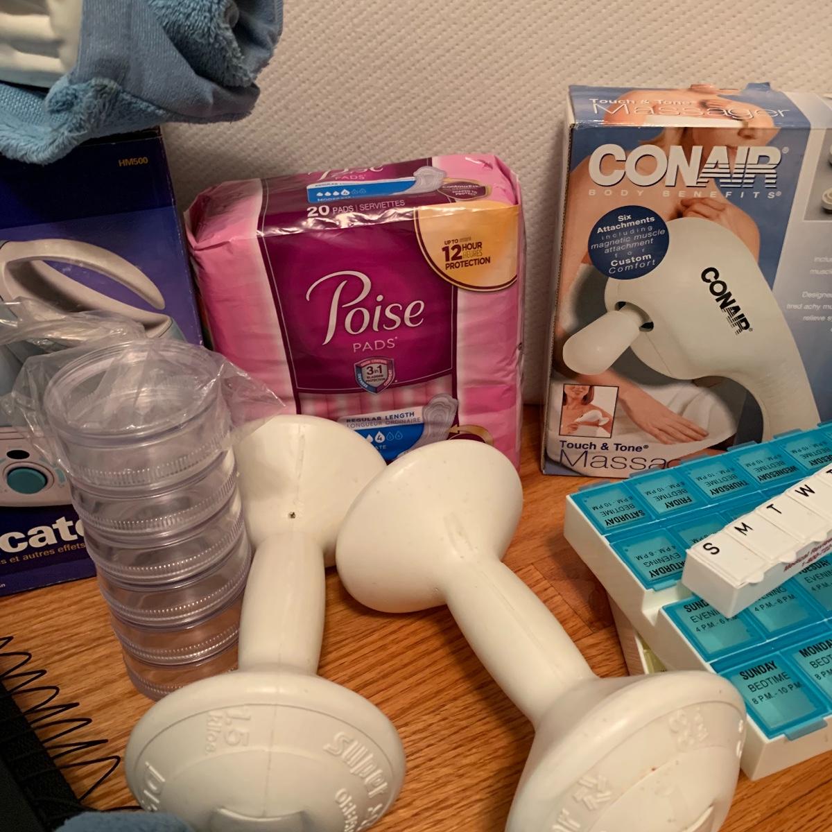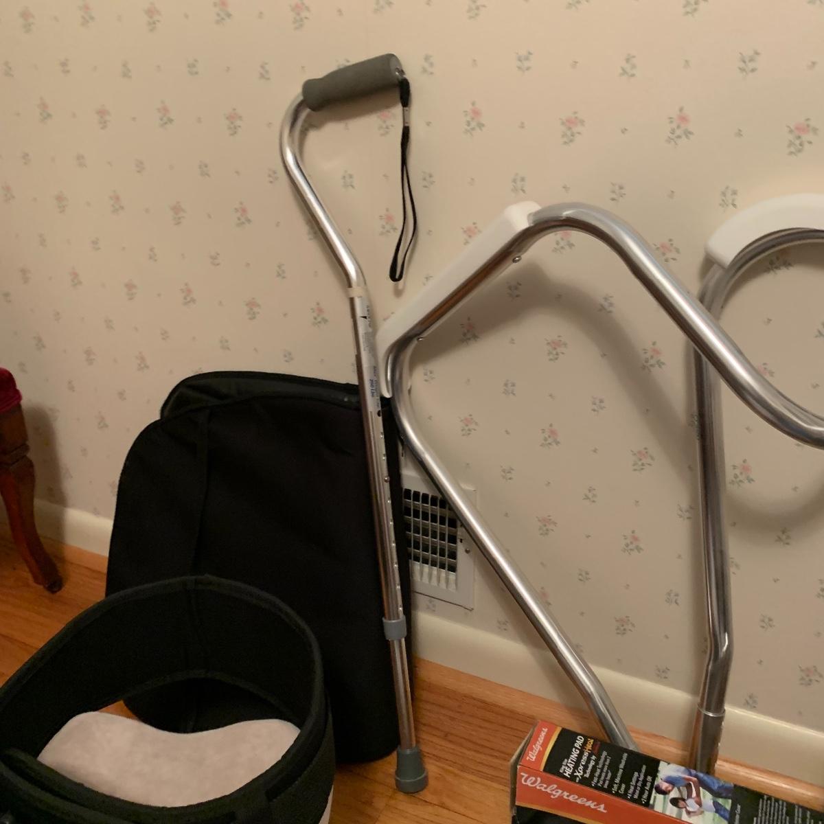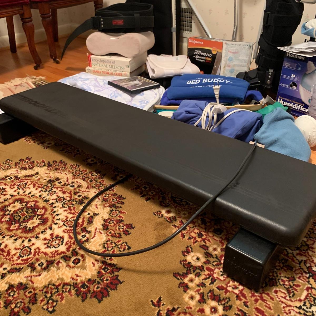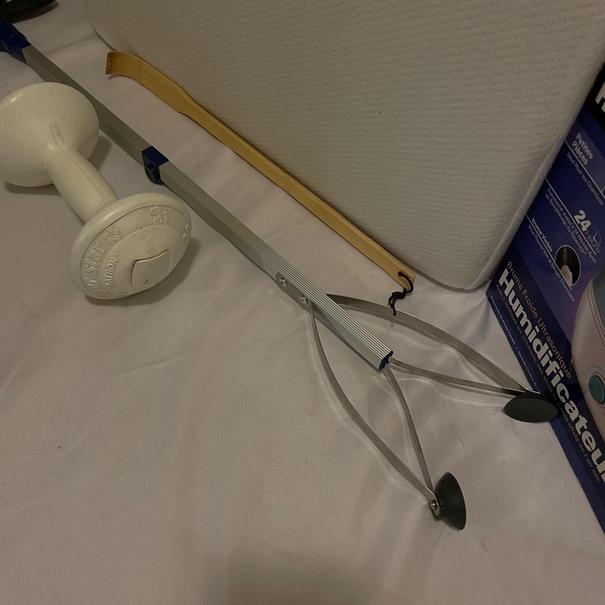This is an extensive home health lot with lots to offer! Included are health books, a walker, weight belts, two walking canes, a new heating pad, several beaded back wraps, a leg brace, a new humidifacateur, a new consortium massager, a leg pillow, a set of 3.3 lb weights, and more. However the true star of this show is a Soloflex WBV vibrating exercise pad. This item is clean, and in good working condition! It even comes with a manual. See images. black cane and walker stand about 33 high, both are adjustable. Memory foam pillow is roughly 21” x 22” x 7.5”. Local pickup only.