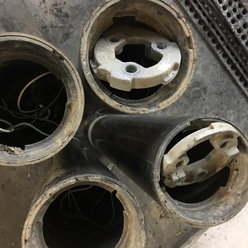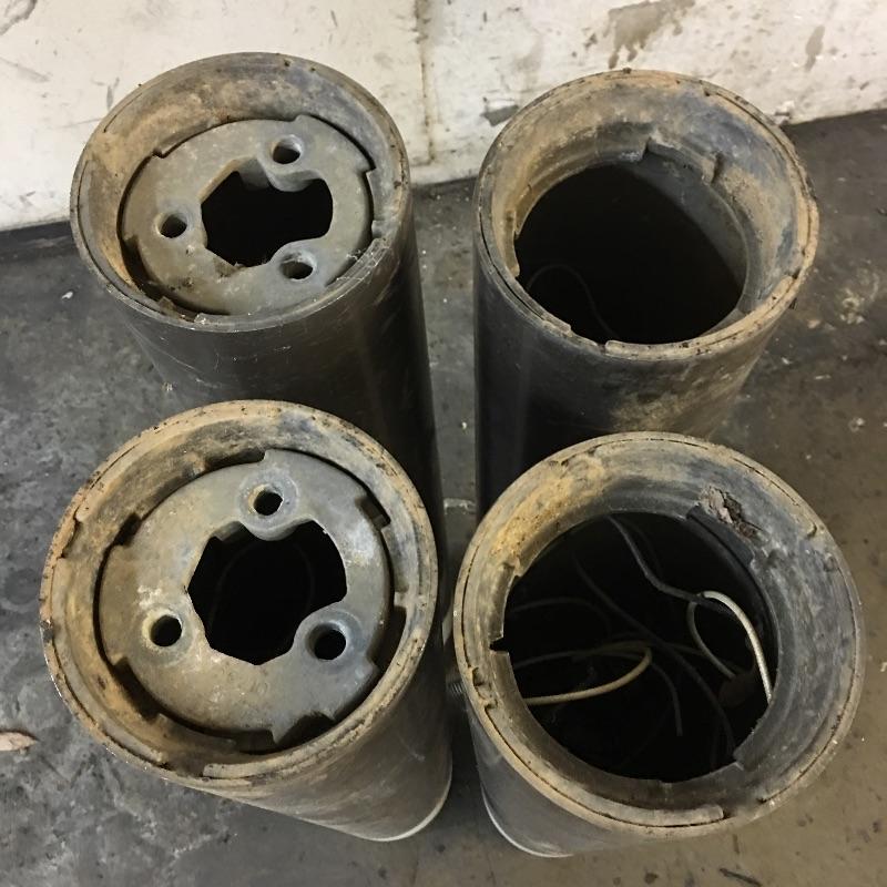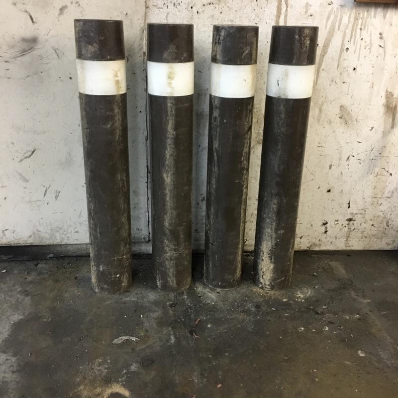 Four lighted metal parking stanchions. Two stanchions have mounting disc and other two are missing them, see pictures. Will also make a great decoration in your man cave or she shed.