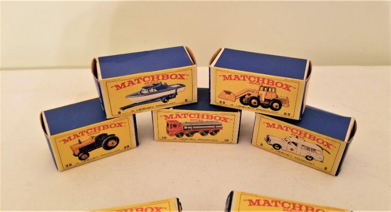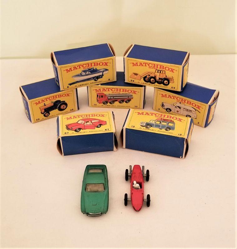 Lot #106  Lot of vintage Matchbox Cars in the original boxes, plus 2 extras.