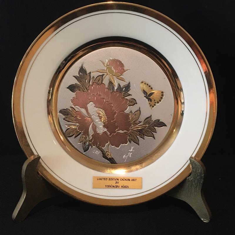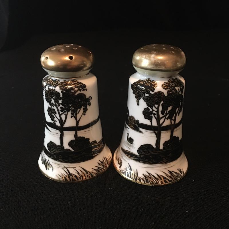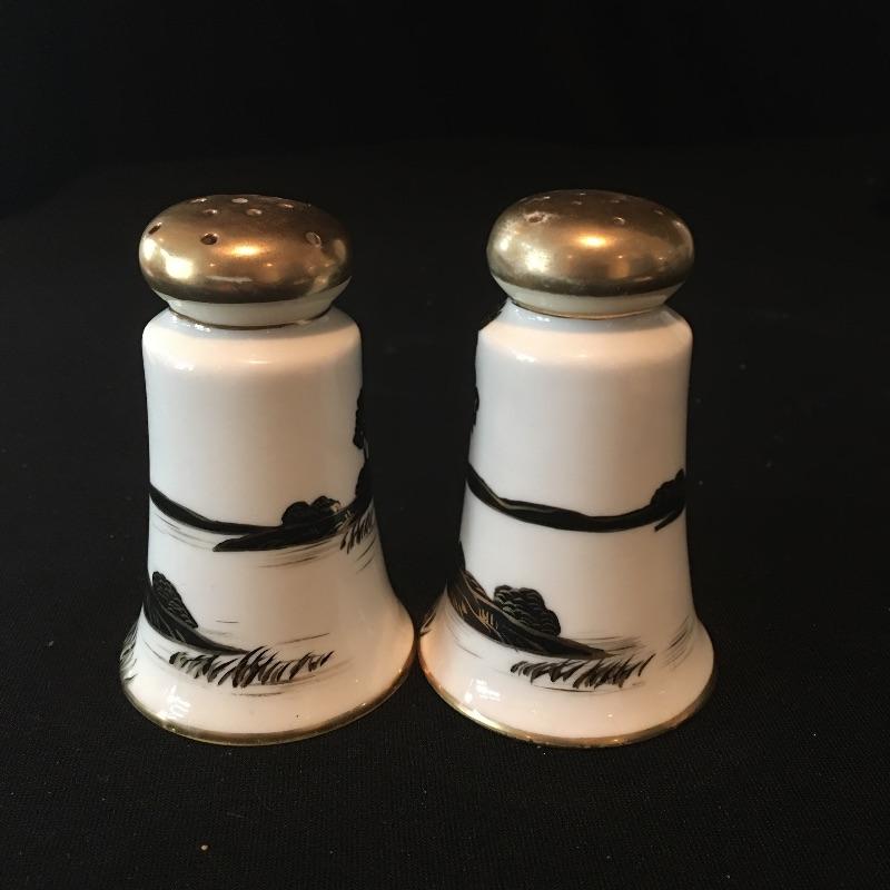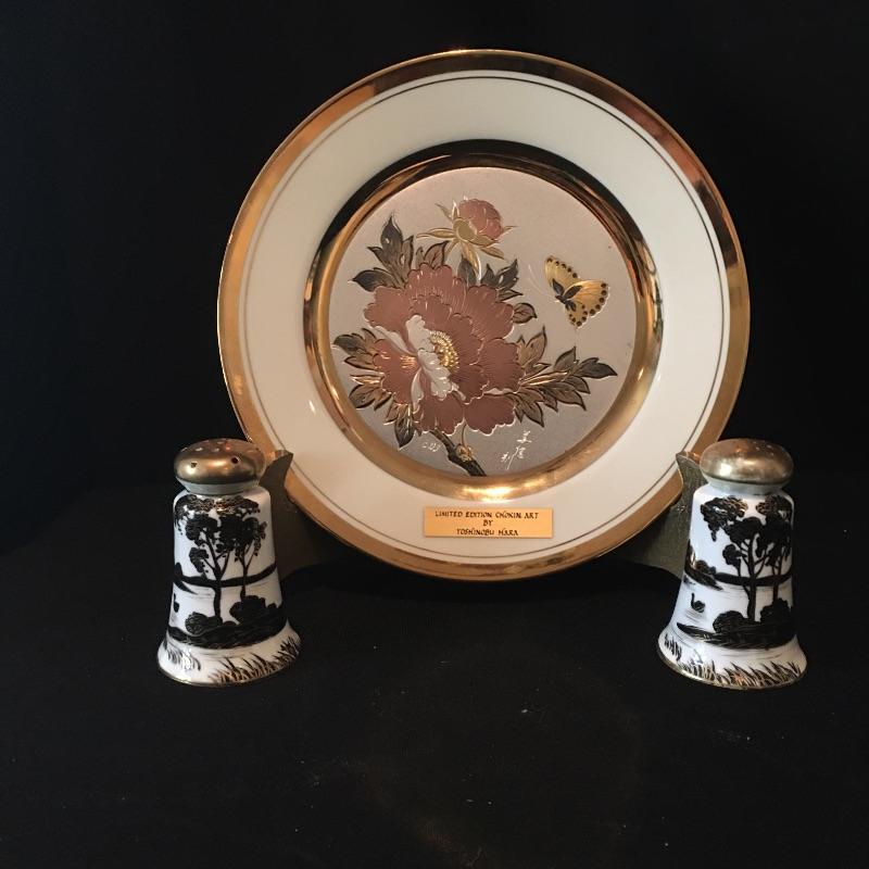 Nippon hand painted salt and pepper shakers and Chokin art numbered plate by Yoshinobu Hara. The unique pair of Nippon salt and pepper shakers will look great on your table. Collector Plate has gold accents and number and artist description on back. It measures 9.25”D.