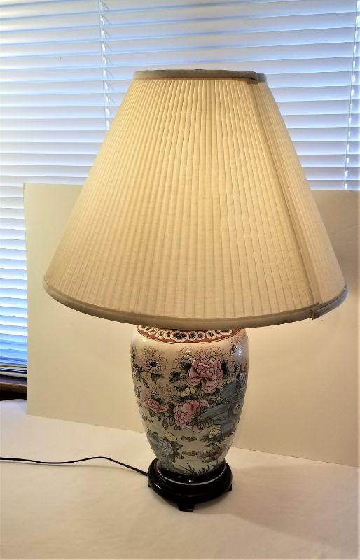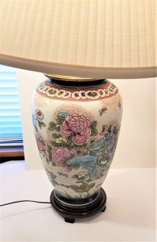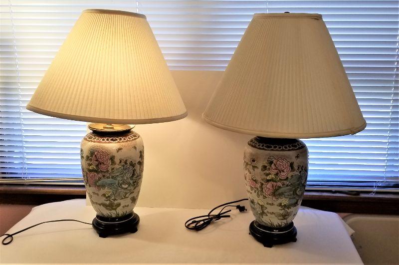 Pair of contemporary tables with Asian styling. Both in working condition. On one the harp is a bit "wiggly." Each stands 28" tall.