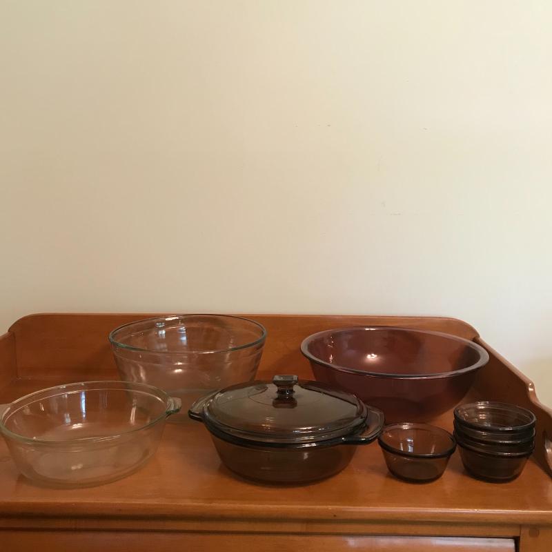 Large lot includes mostly Pyrex pieces with some Anchor and more. Quart and pint measuring glass, lidded Pyrex nesting bowl set with five bowls and four lids. Three loaf pans, four 6oz custard bowls, four pie pans, two large mixing bowls and more! See photos, local pickup only.