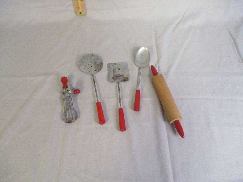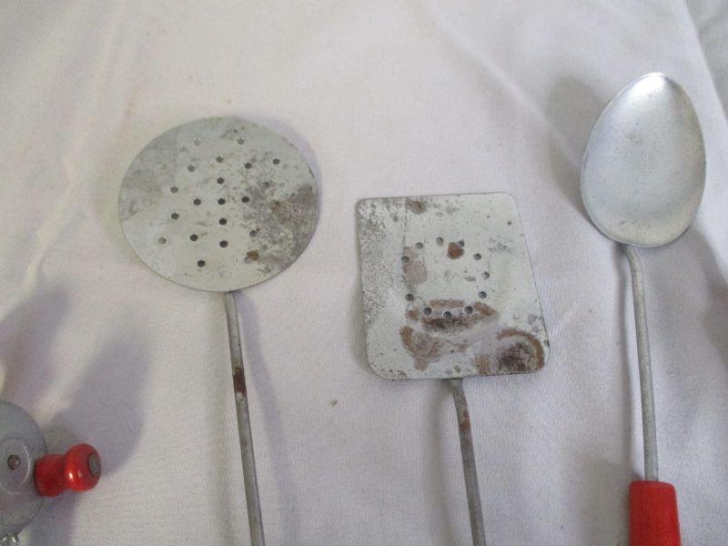 The pieces have wood handles and metal bodies. The rolling pin is all wood. The spatula and strainer are discolored, but not rusted.