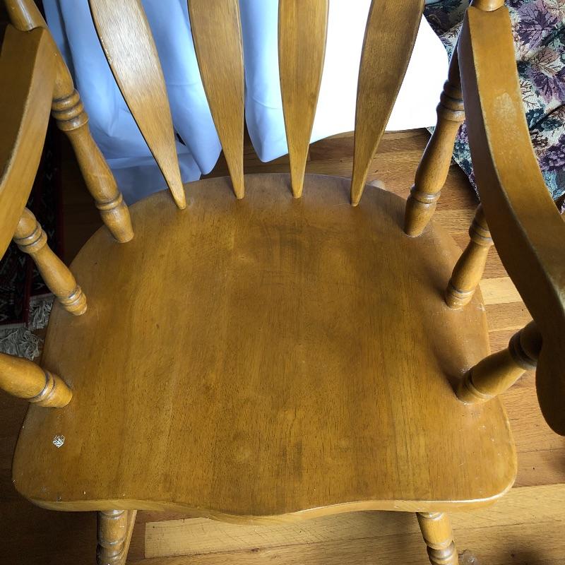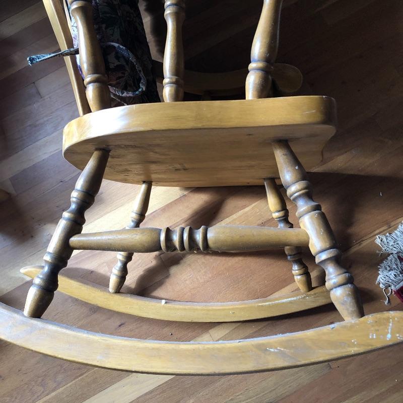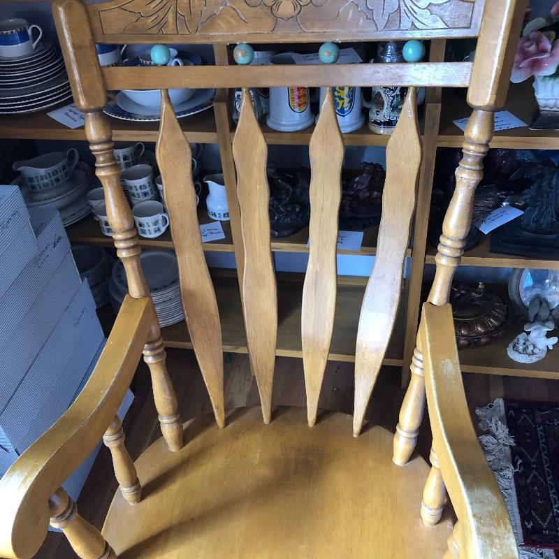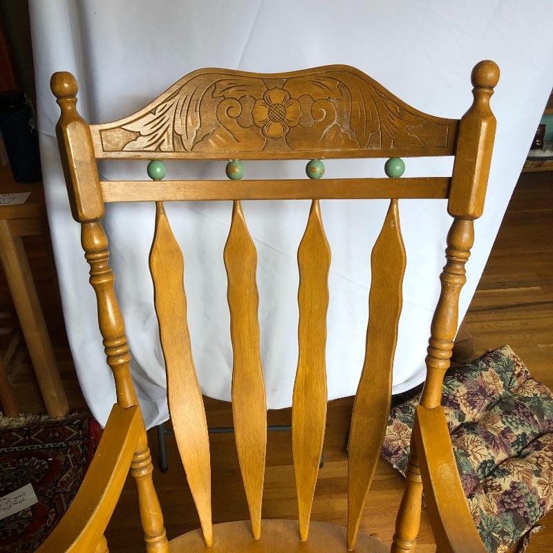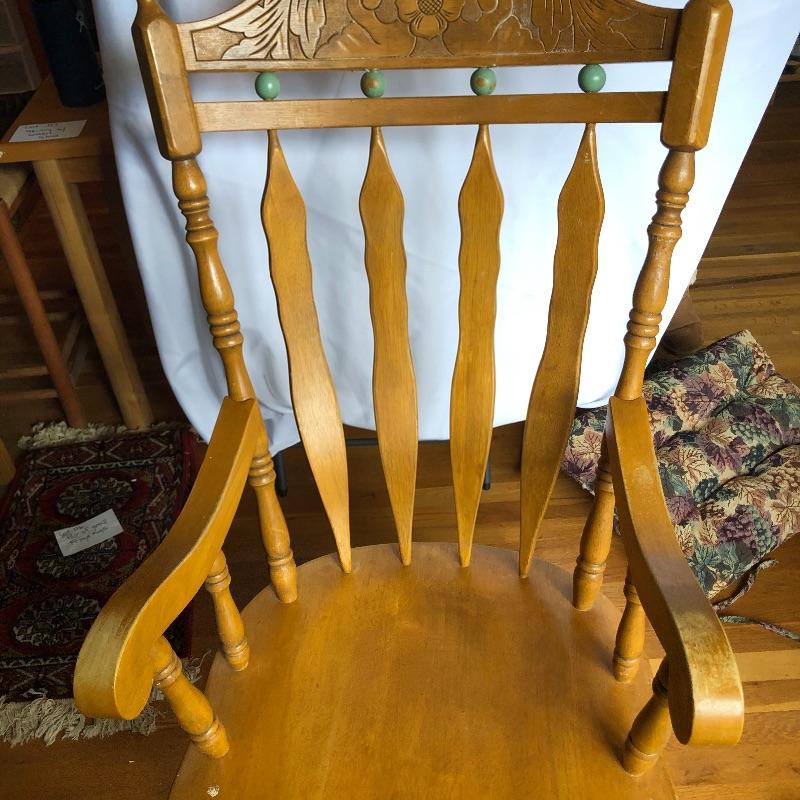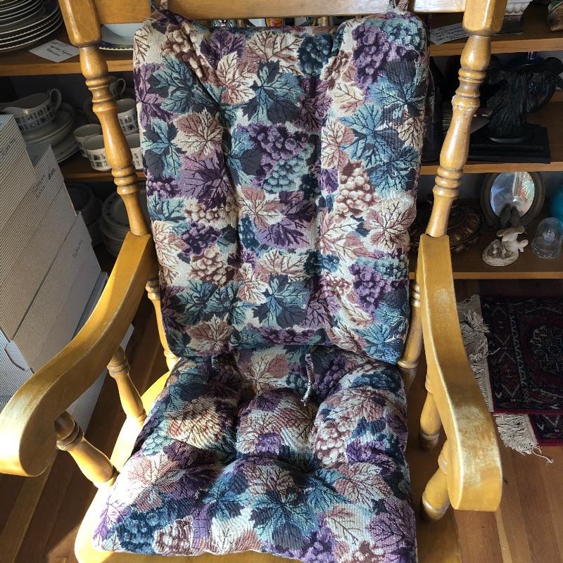 Rock the day away in this large, comfortable, wooden rocker! The seat measures 22” x 20” and the seat is 45” tall. Cushions are included. Local pick up only.