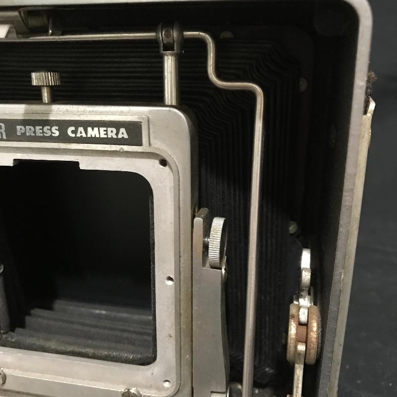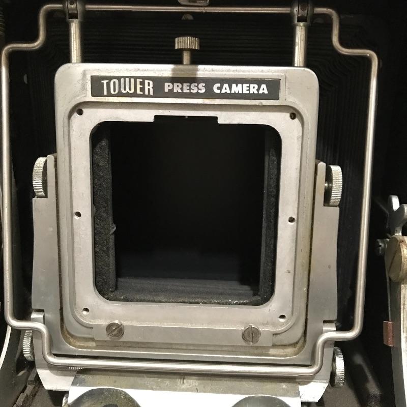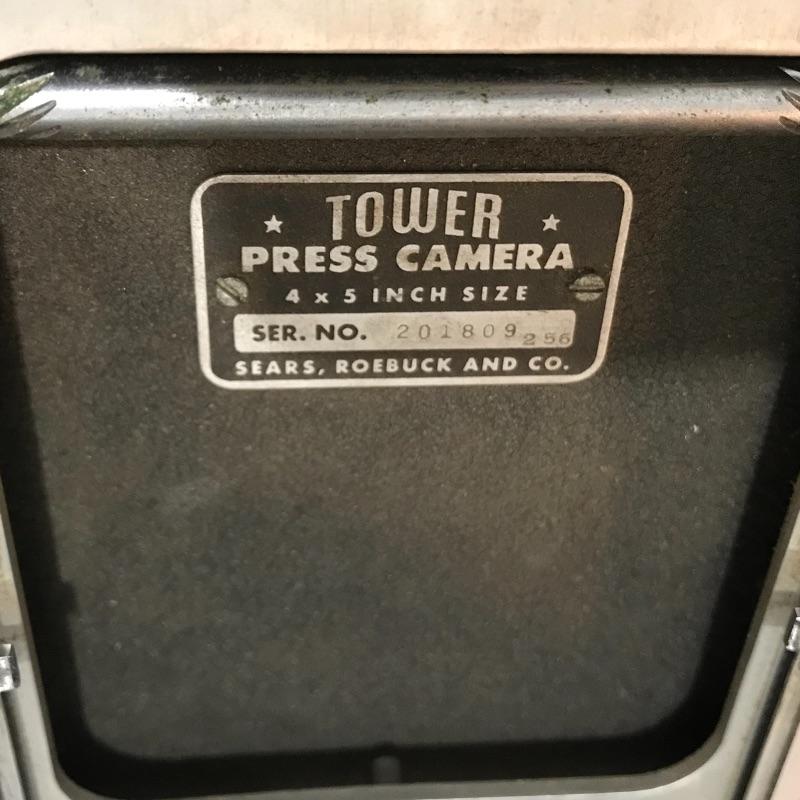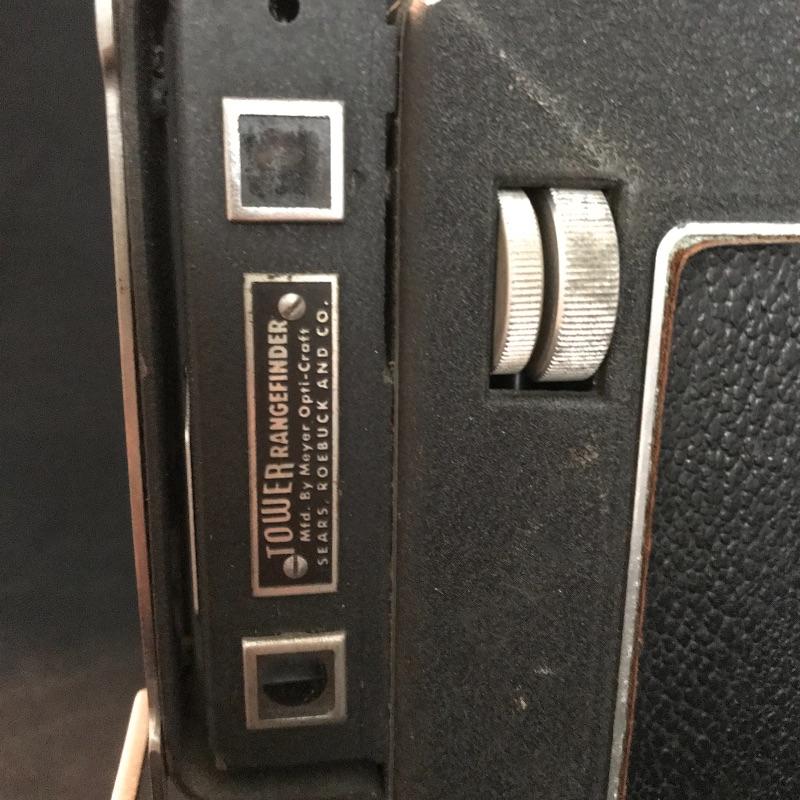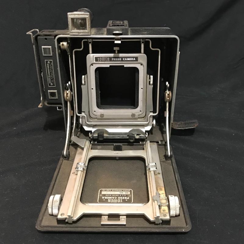 Sears Roebuck and Co Tower Press Camera shell and some inside pieces with Tower Rangefinder and four Lisco Regal II double film holders for two sheets of 4 x 5 format film. Tower Press Camera serial number 201809, 256, has bellow, but most inner workings are missing. Some gears also appear fixed and in need of some restoration. Shipping available.