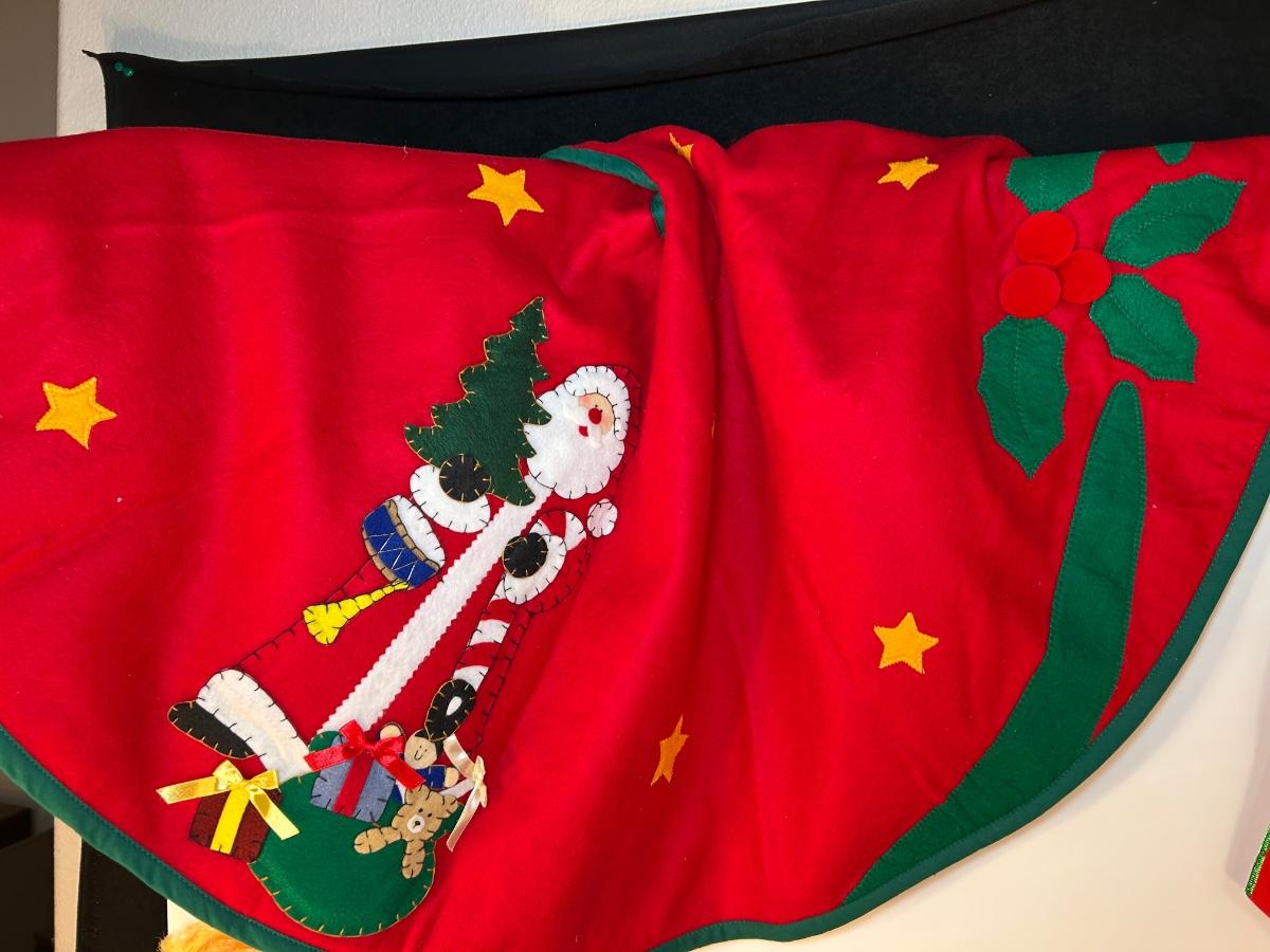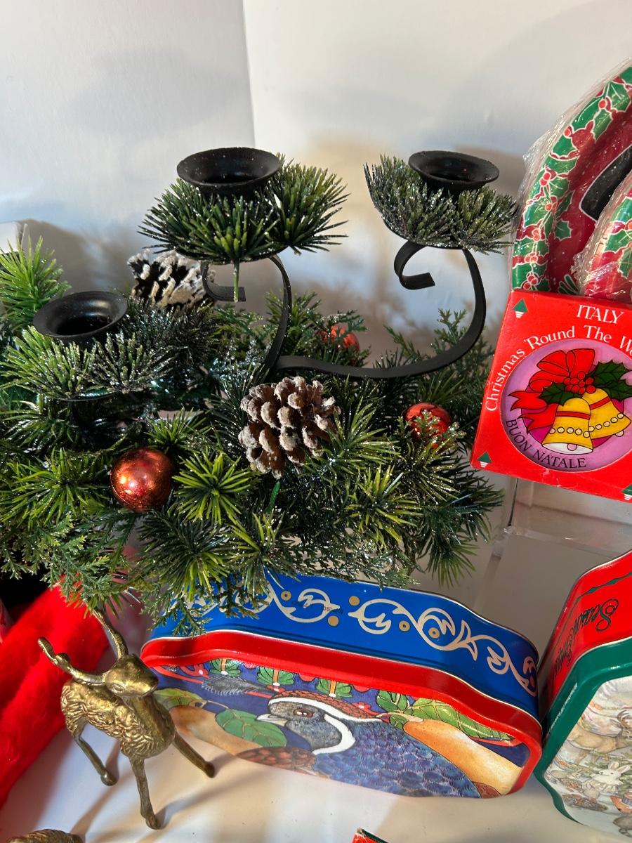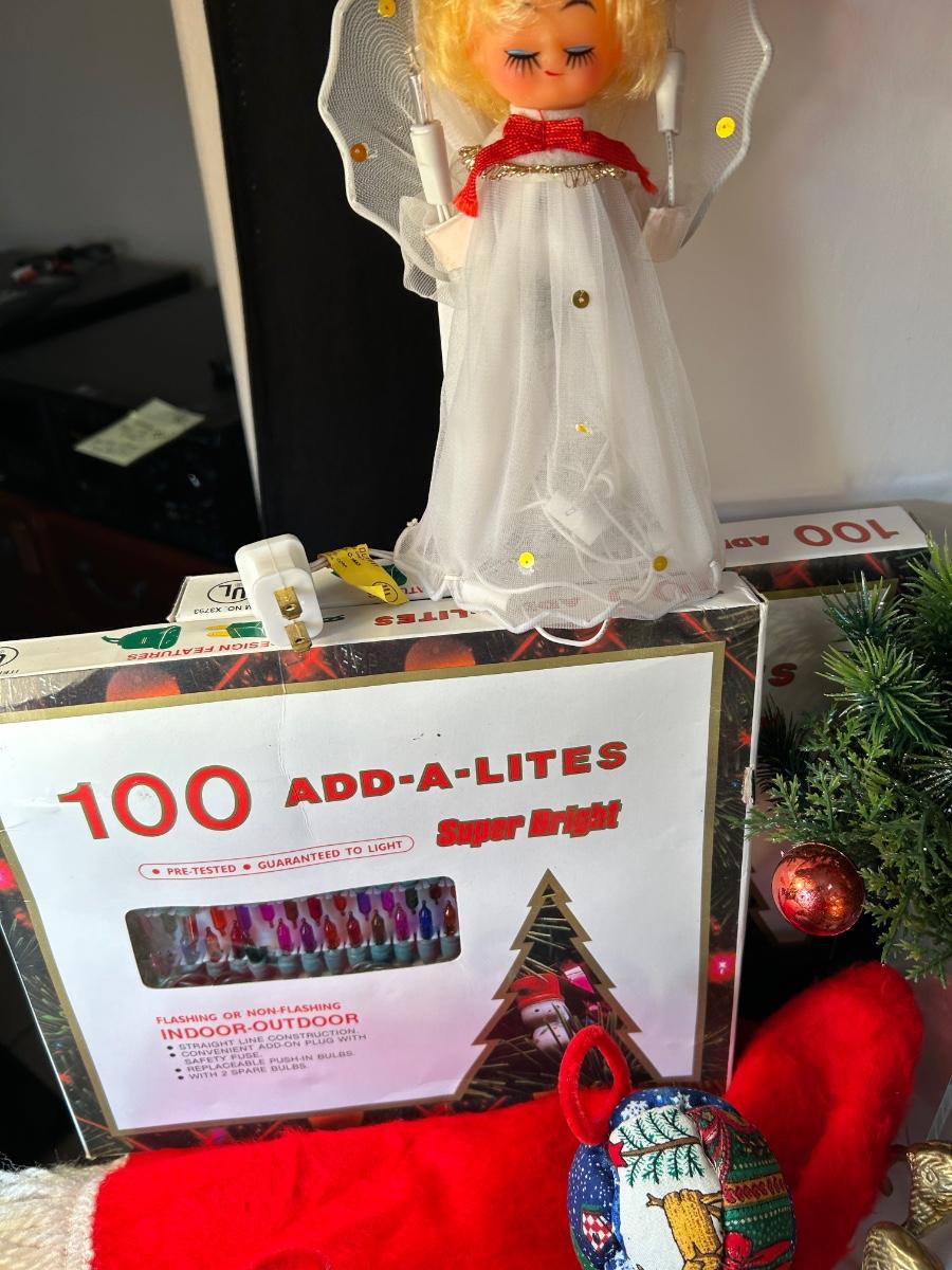 Too much to list everything!! Includes a large & small tree skirt, 2 boxes of lights, 3 stocking hangers, plates & napkins, vintage angel topper, ornaments and other Christmas things.