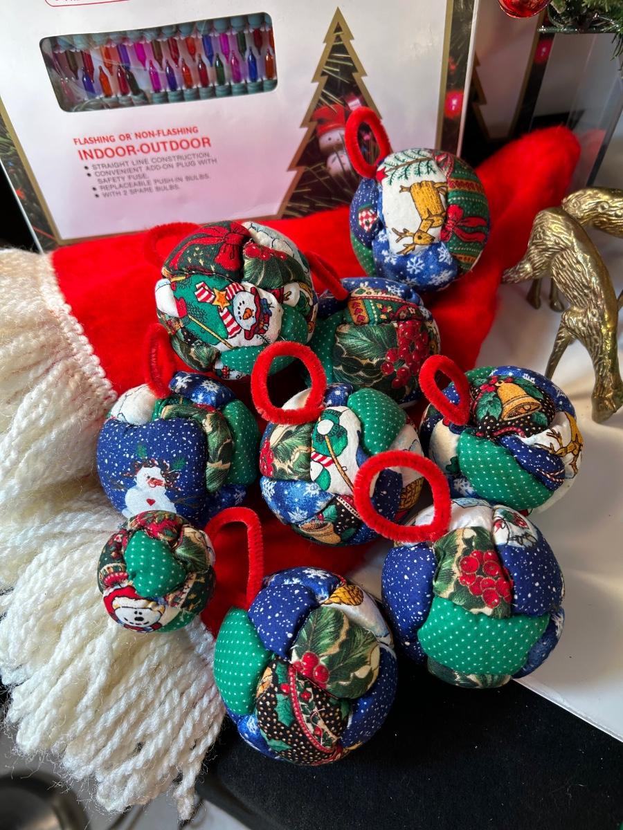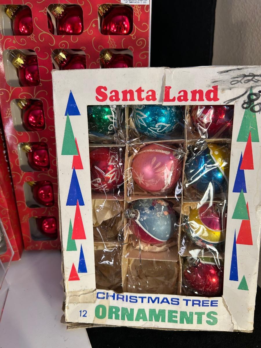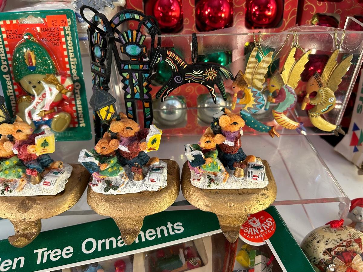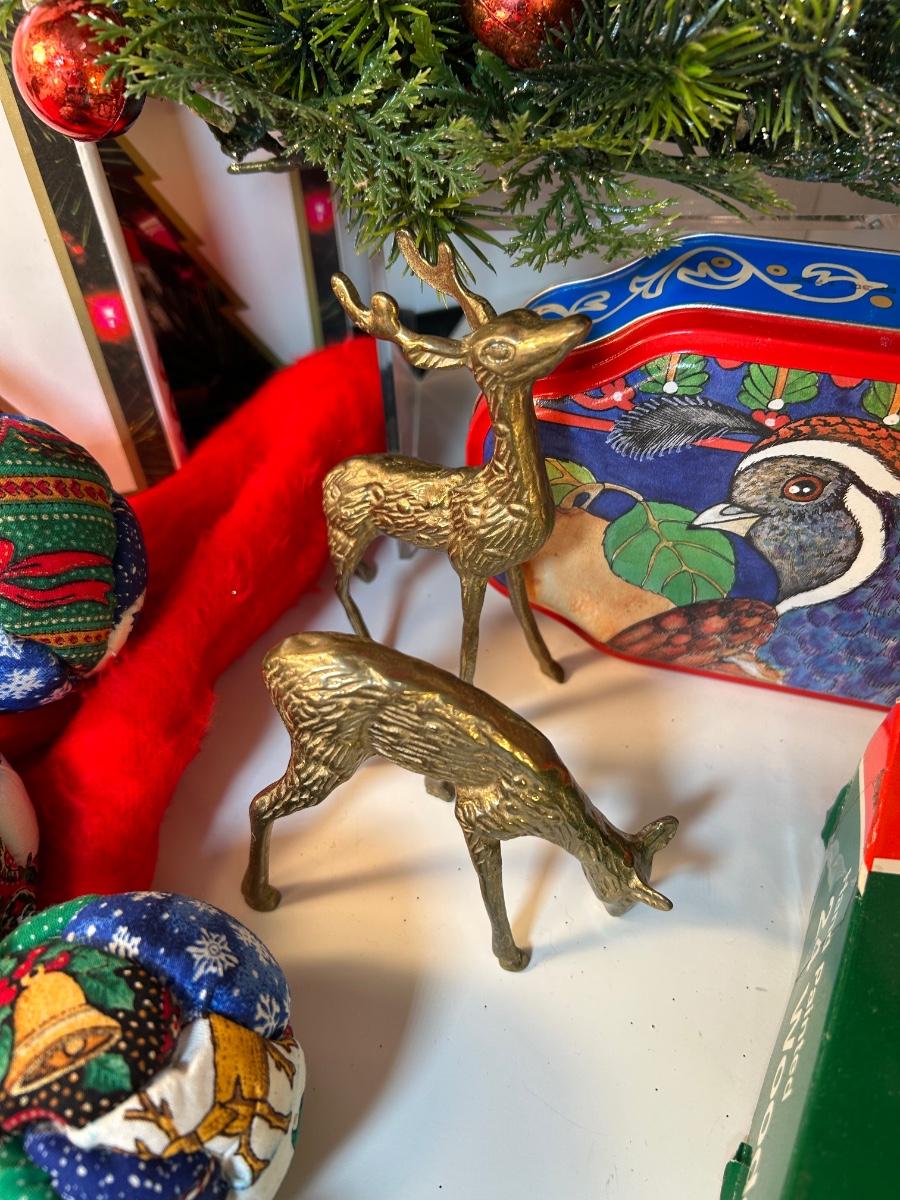 Too much to list everything!! Includes a large & small tree skirt, 2 boxes of lights, 3 stocking hangers, plates & napkins, vintage angel topper, ornaments and other Christmas things.