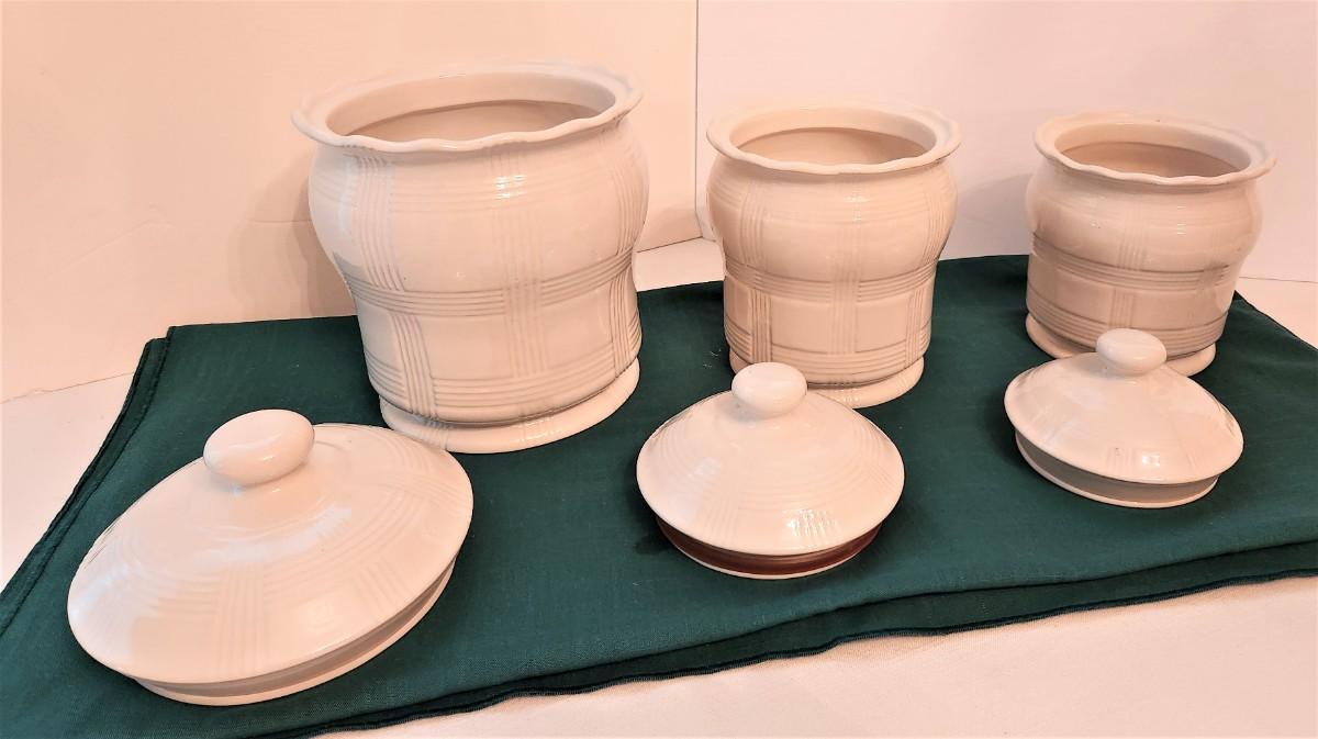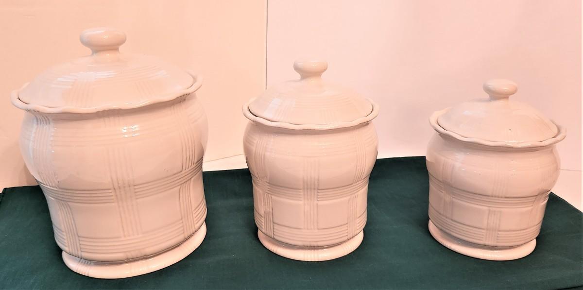 Nice matched set of 3 contemporary white stoneware canisters with lids, no maker noted - all in good condition. 10" tall, 8.5" tall, and 7.5" tall.