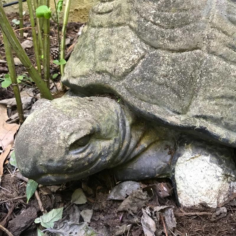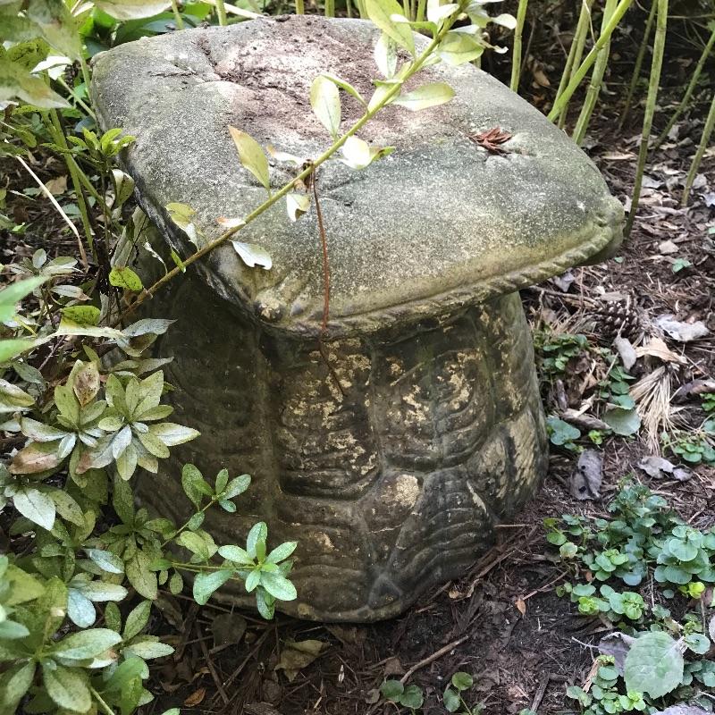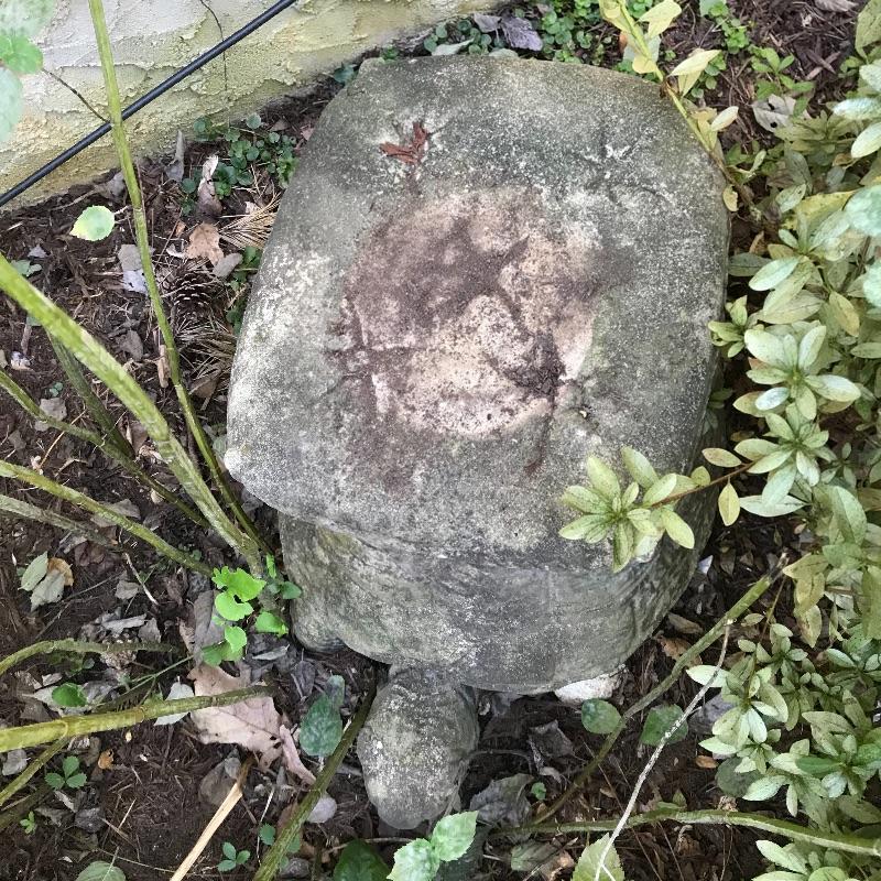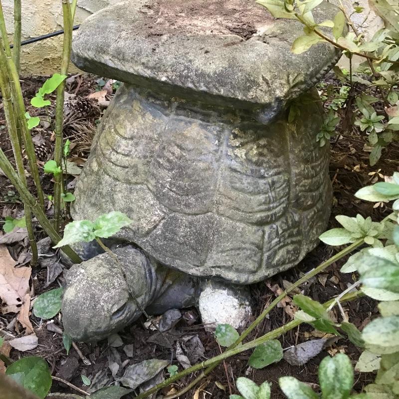 So much character in this turtle table-statue. A sly smile and nice detailed shell is perfect hiding in the bushes or on display for all to see. This beast is extremely heavy and will require more than one person to move and load. Please bring help. Turtle measures approximately 14” x 21” x 15”. See photos. No shipping.