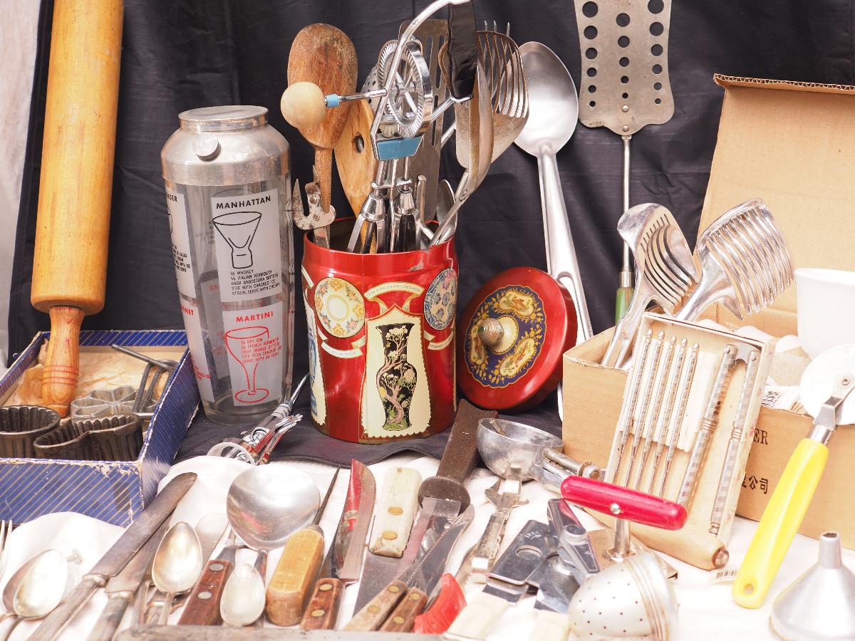 Lot 106 Vintage Kitchen tools and collectibles: Nice knives, Cutco, 1950's tools, Nut picks and cracker, vintage shaker, tin with lid, Consumer Ice company tool, Swedish iron Rosette makers.