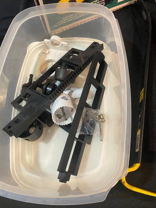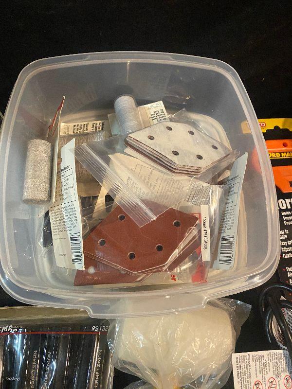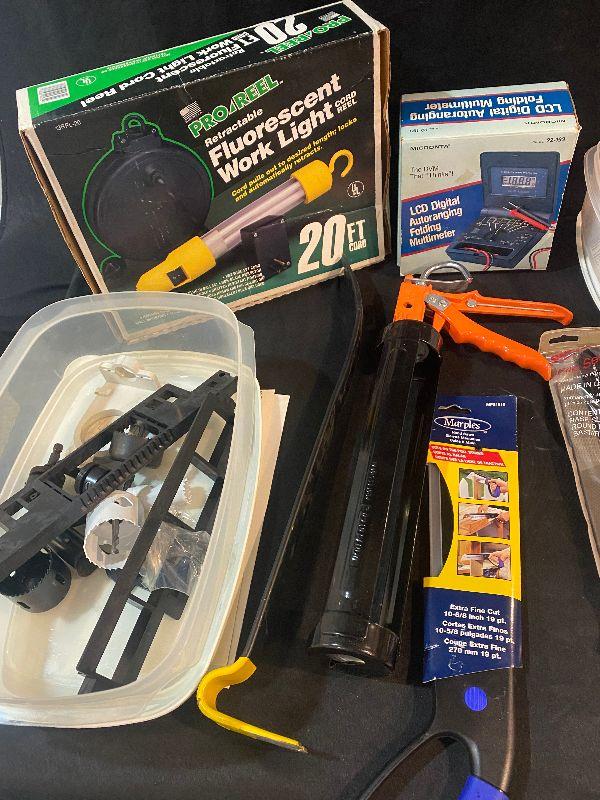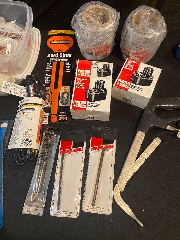 Circular drill bits, 2 Porter-Cable 12V batteries, extension cord. sandpaper, saw, saw blades, LCD digital auto-ranging folding multi-meter strike & latch, retractable and more.