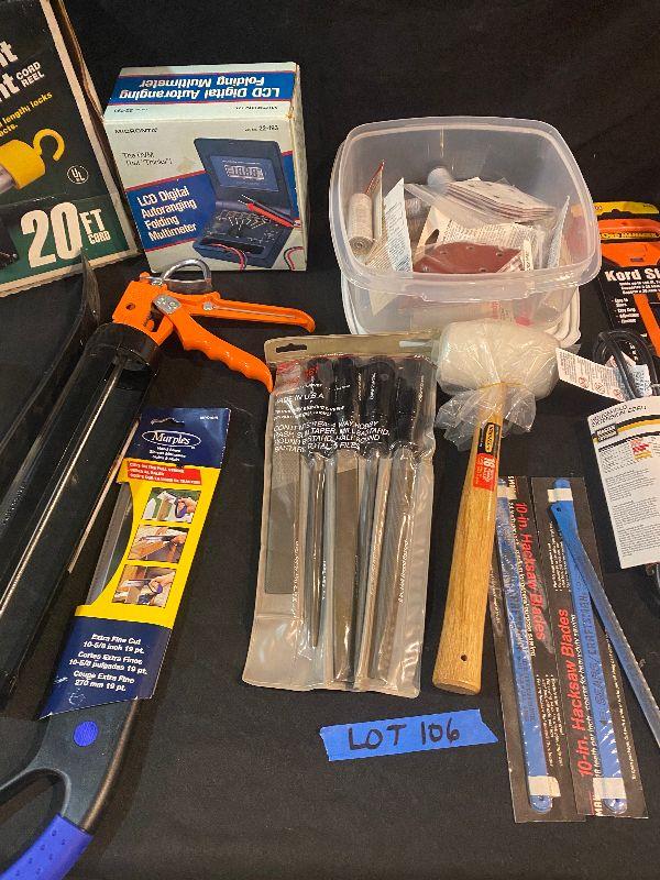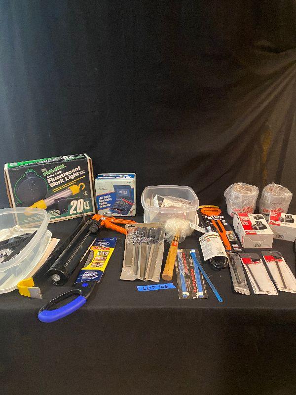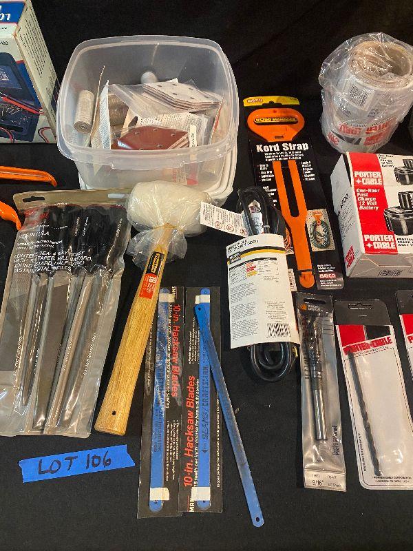 Lot 106 - Tools, Hardware and Accessories (Circular drill bits, 2 Porter-Cable 12V batteries. saw, saw blades, LCD digital auto-ranging folding multi-meter strike & latch, and much more!).