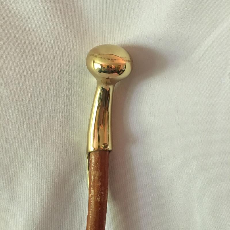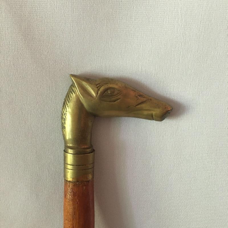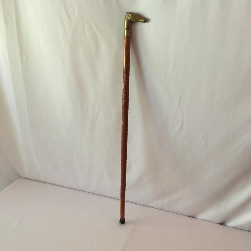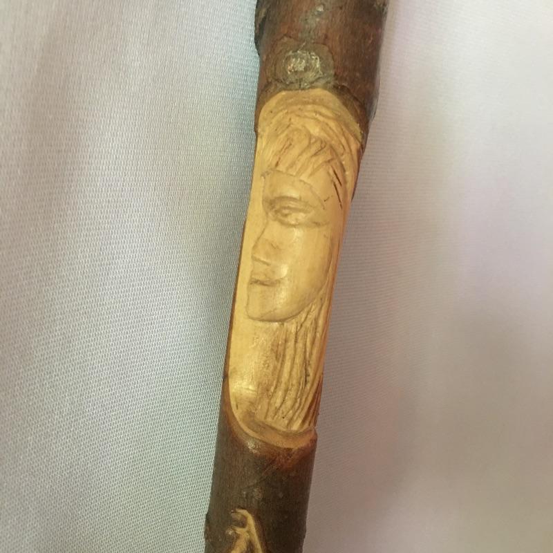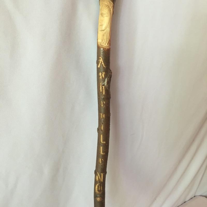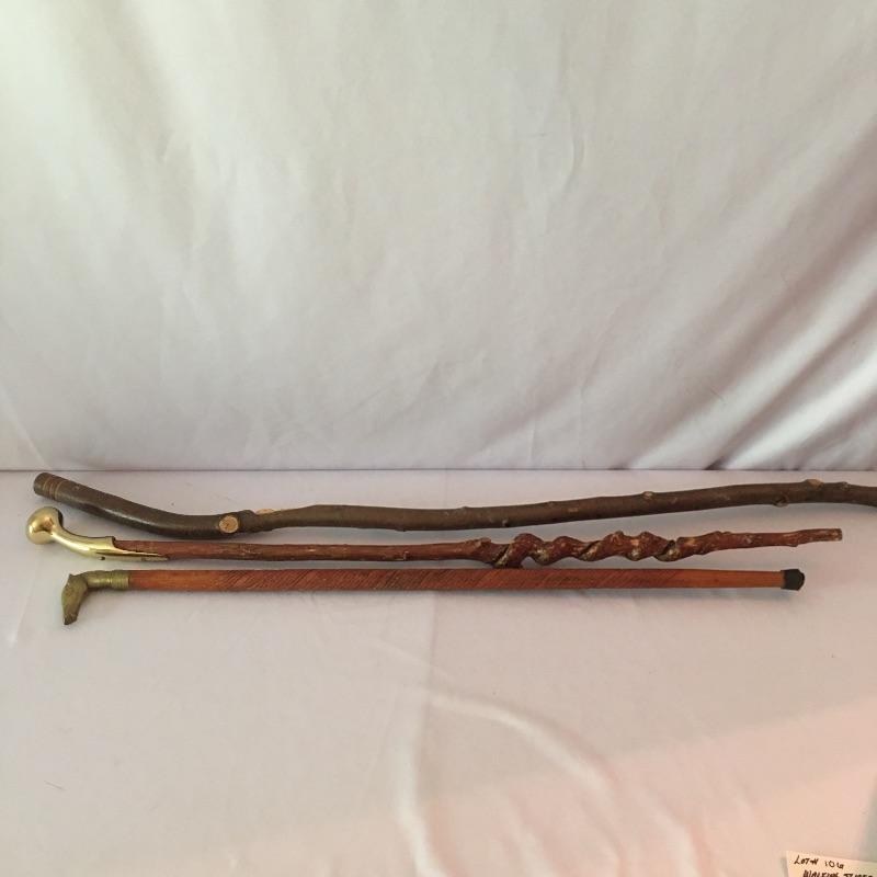 Trio of walking sticks. Lot includes one carved stick with face and Asheville NC, one brass knobbed stick and one stick with brass horses head and carved stick.