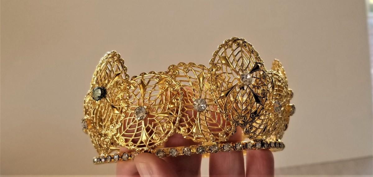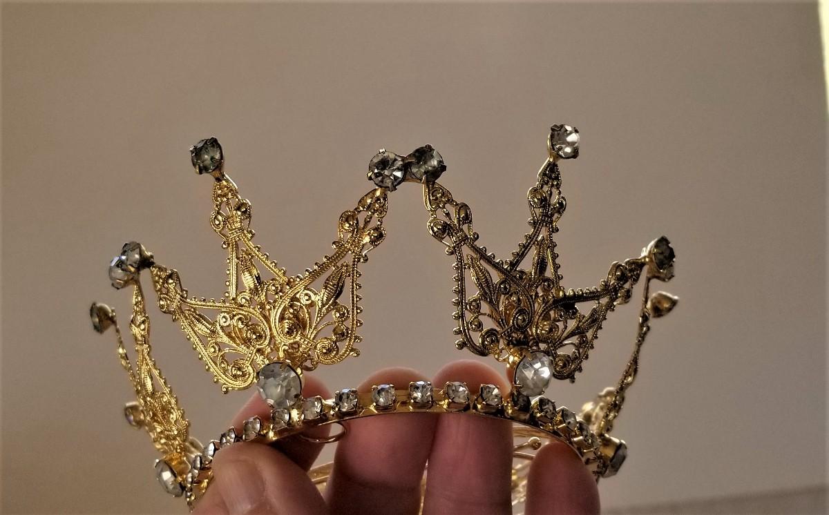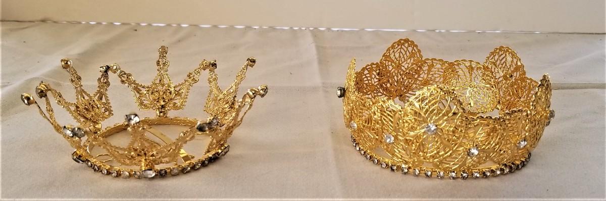 Two sweet "Maid" tiaras - worn in a Mardi Gras court. Both are gold tone with rhinestones. Each has a bar and clip across the headpiece, along with rings where bobby pins can be used to make sure tiara stays in place. Good used condition. They are both about 2" tall. All stones present. Your little girl will love playing with these.