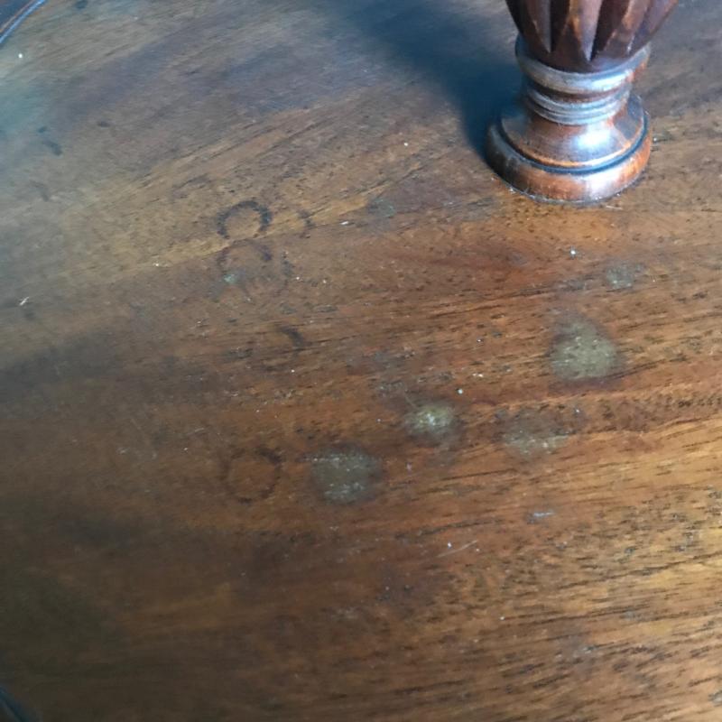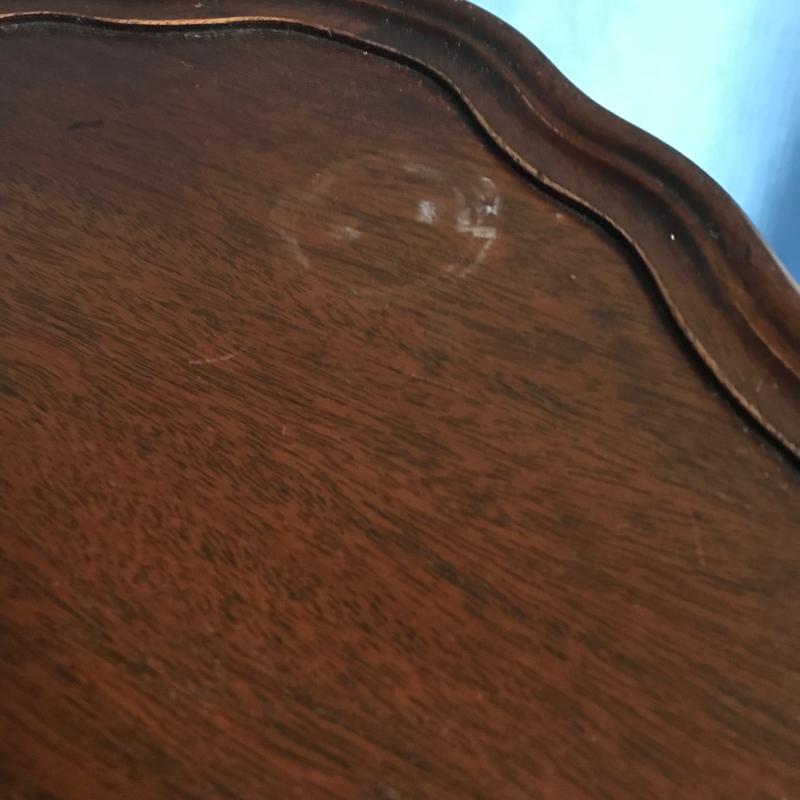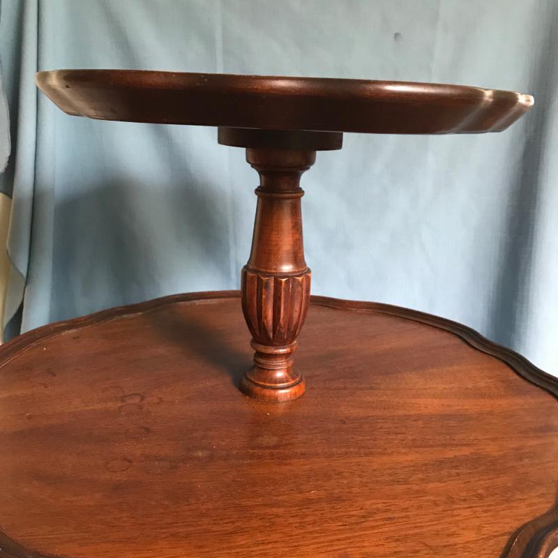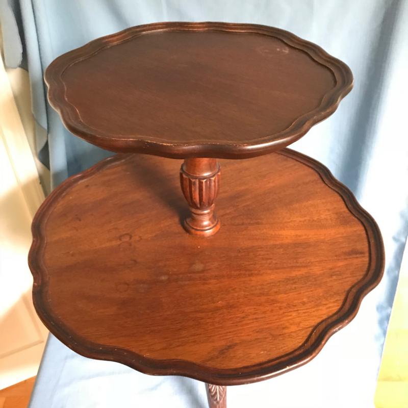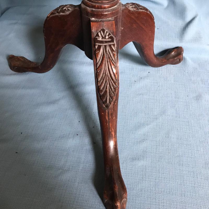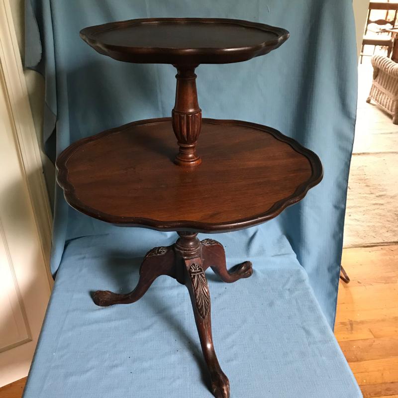 Beautiful claw foot side table with two tiers. Gorgeous curved edges, carved detail and claw feet. Very functional with two levels. small water stain on top. Measures 24”diameter by 30” high. No shipping. Local pick up only.
