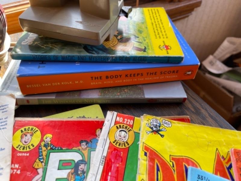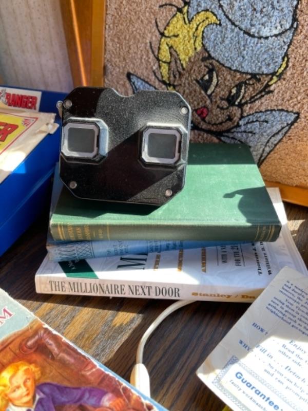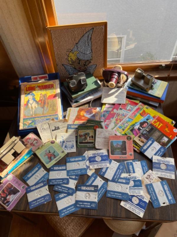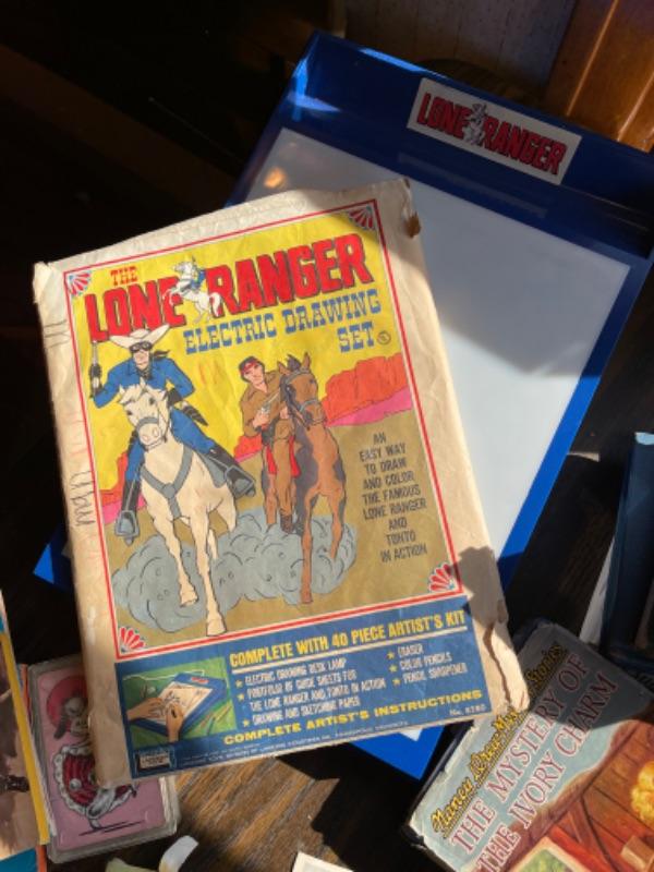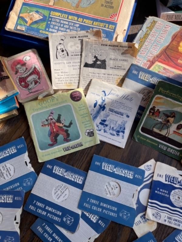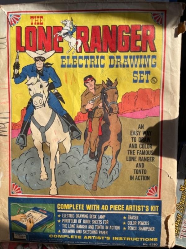Lot 106. Vintage electric drawing kit-Lone Ranger, vintage comic books, vintage children’s framed art, electric View Masters and View Master rells--$75