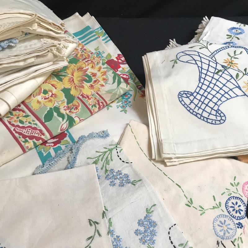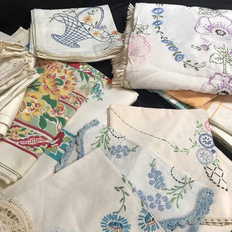 Lot includes many pieces of hand-crocheted lace and embroidered linens. Linens include tablecloths, napkins, and more. See pics. Shipping available.