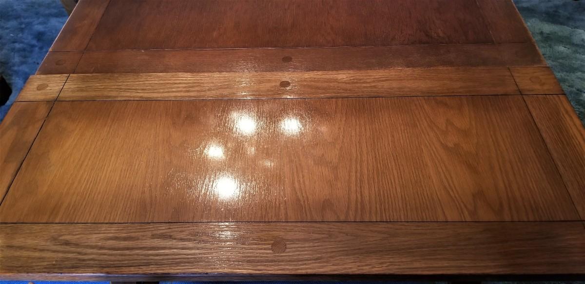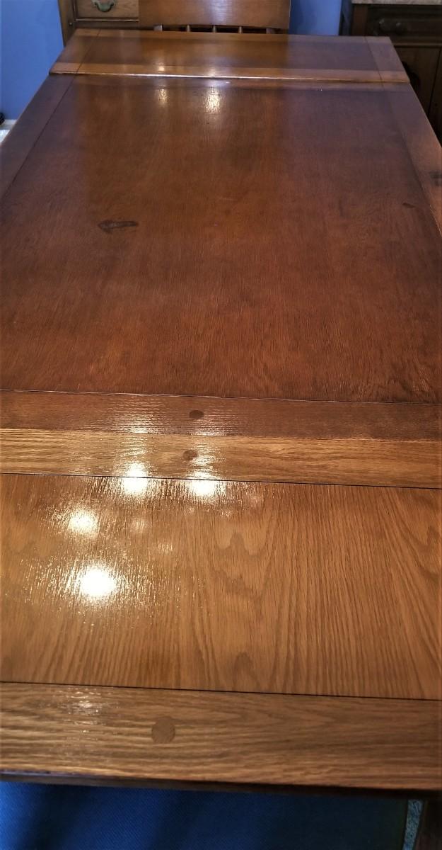 Great vintage set here - 1920's or 30's. Solid oak with lift out leaves on the ends. Six matching chairs (one is an armchair). When fully extended it measures 86" long, without the leaves it is 54" long. 38" across, 28" tall. Check all photos carefully - you will see there are a couple of "spots" on the table. The leaves are lighter than the main table as they were not used nearly as much.