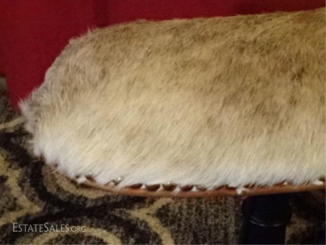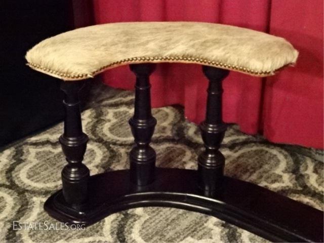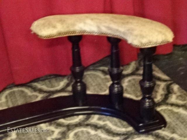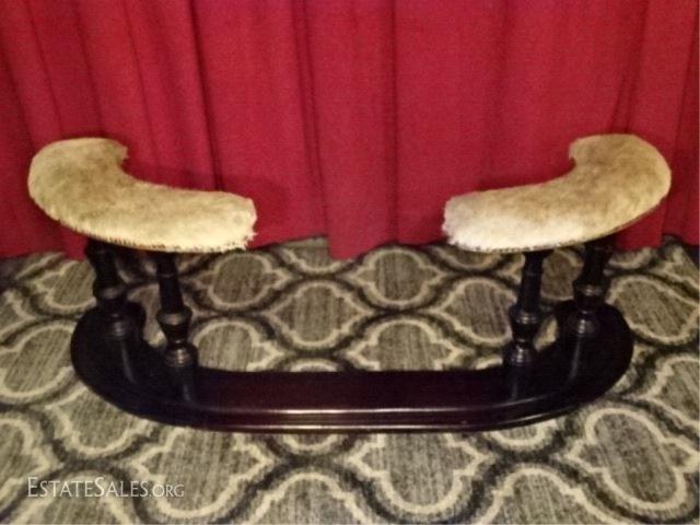 LOT 106: VINTAGE WOOD FIREPLACE FENDER BENCH, NATURAL HIDE SEATS, NAILHEAD TRIM, BLACK FINISH, VERY GOOD CONDITION, 67" X 21" X 22"